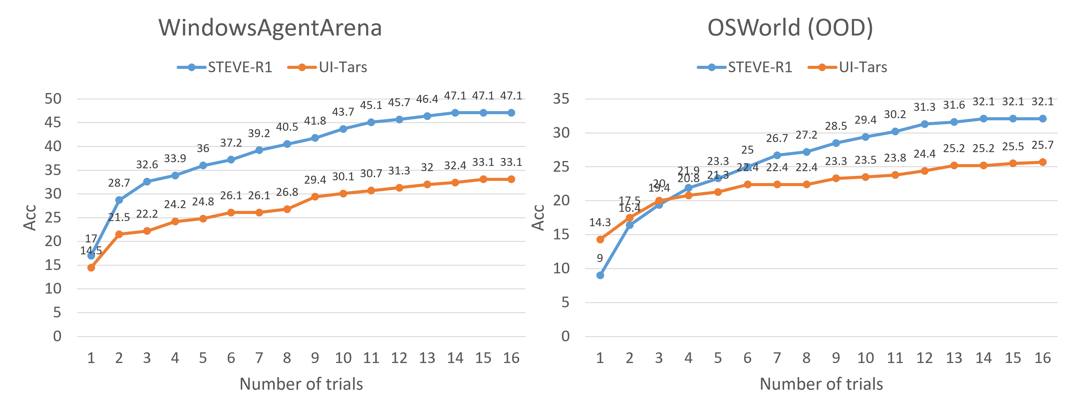 We evaluate the performance of the **STEVE-R1 agent** on both in-domain WindowsAgentArena (Windows 11 OS) and out-of-domain OSWorld (Ubuntu OS) benchmarks. The evaluation involves 16 attempts per task, with task completion rates recorded as the primary metric. In the in-domain Windows 11 setting, the STEVE-R1 agent demonstrated a **14%** higher task completion rate compared to the previous open-source state-of-the-art model, UI-TARS-7B-DPO. Furthermore, in the out-of-domain Ubuntu OS environment, where STEVE-R1 was not explicitly trained, it still achieved a **7%** higher task completion rate than UI-TARS-7B-DPO.