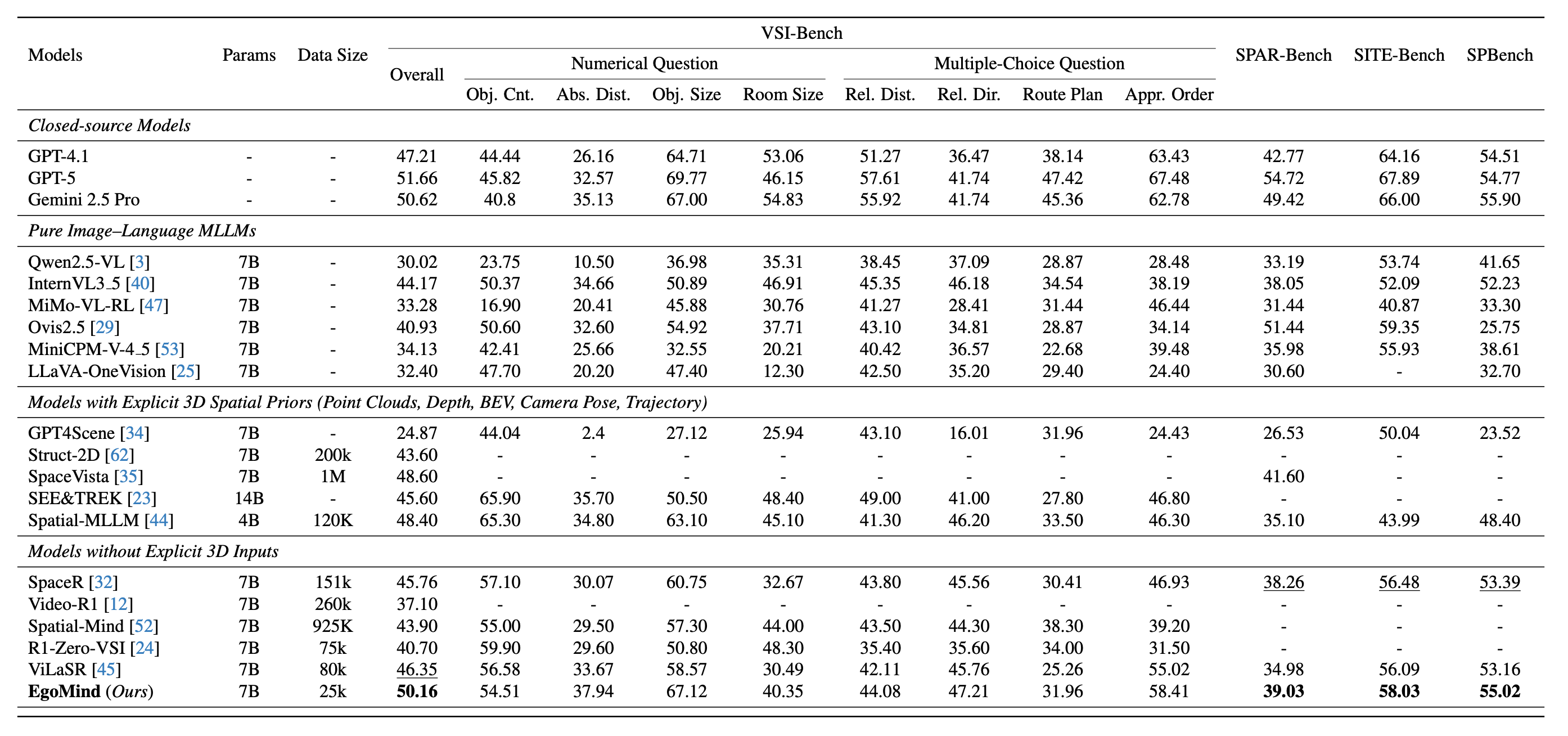 With only 5K auto-generated SFT samples and 20K RL samples, EgoMind achieves competitive results on VSI-Bench, SPAR-Bench, SITE-Bench, and SPBench, demonstrating the potential of linguistic reasoning for spatial cognition.