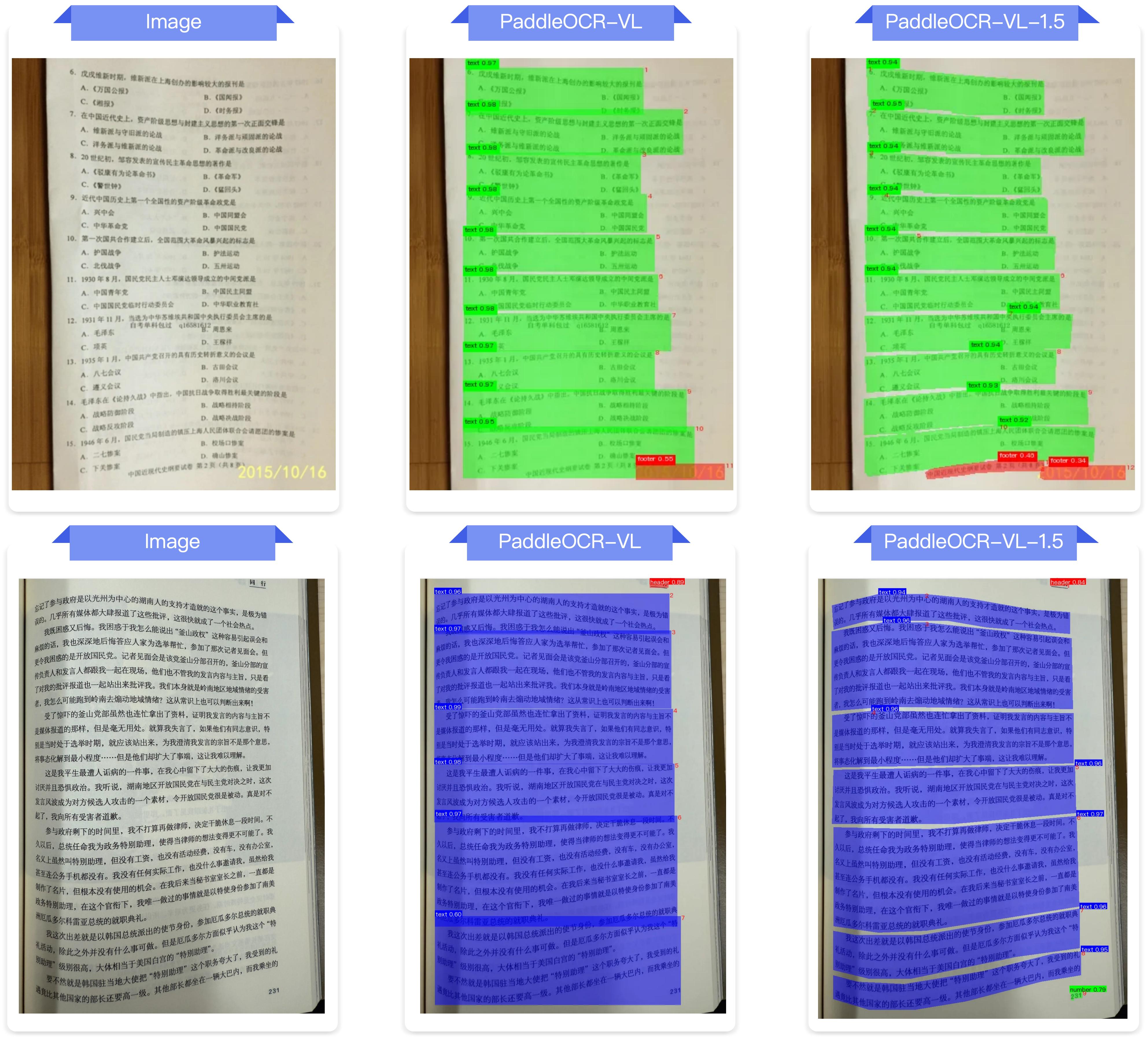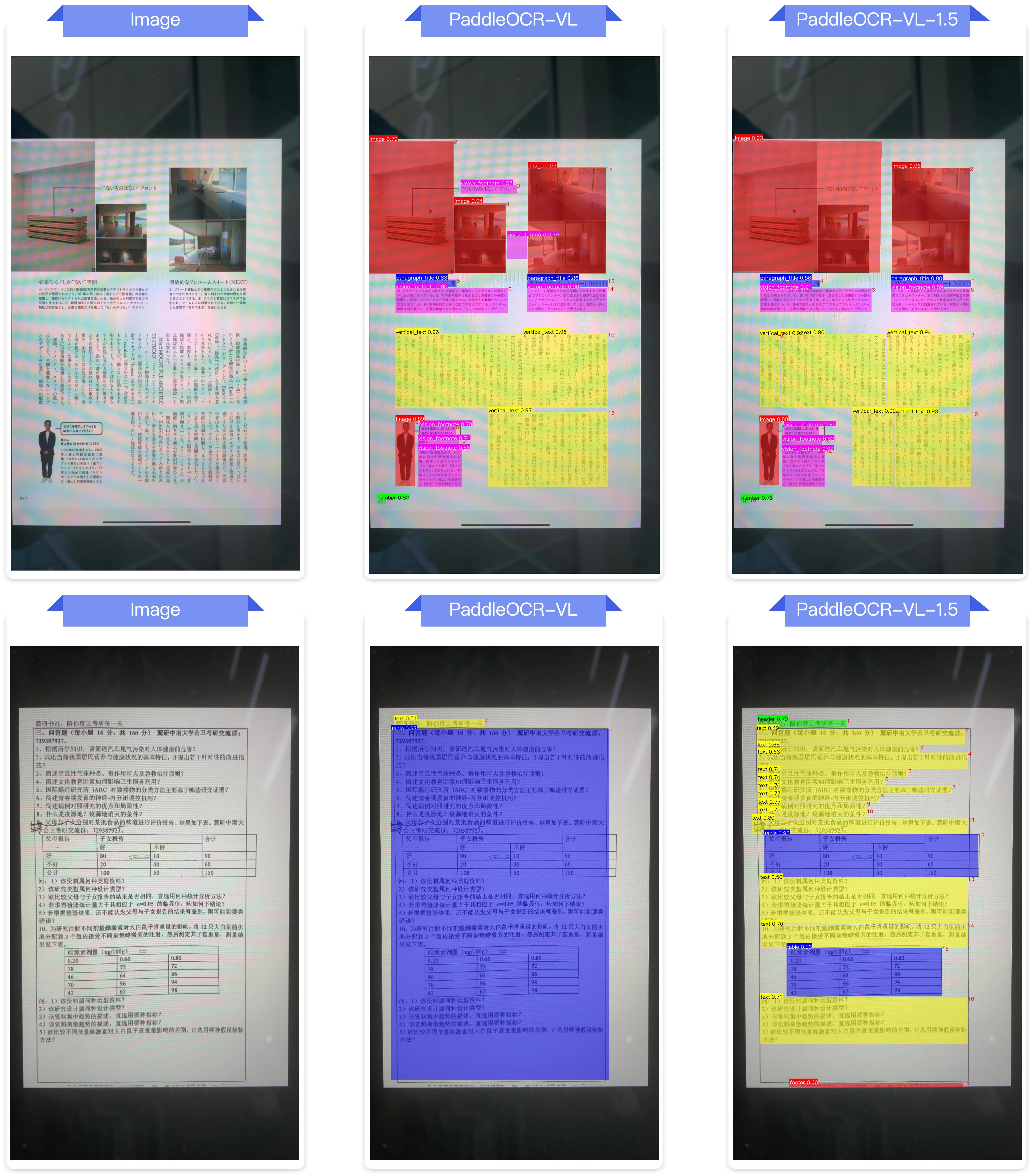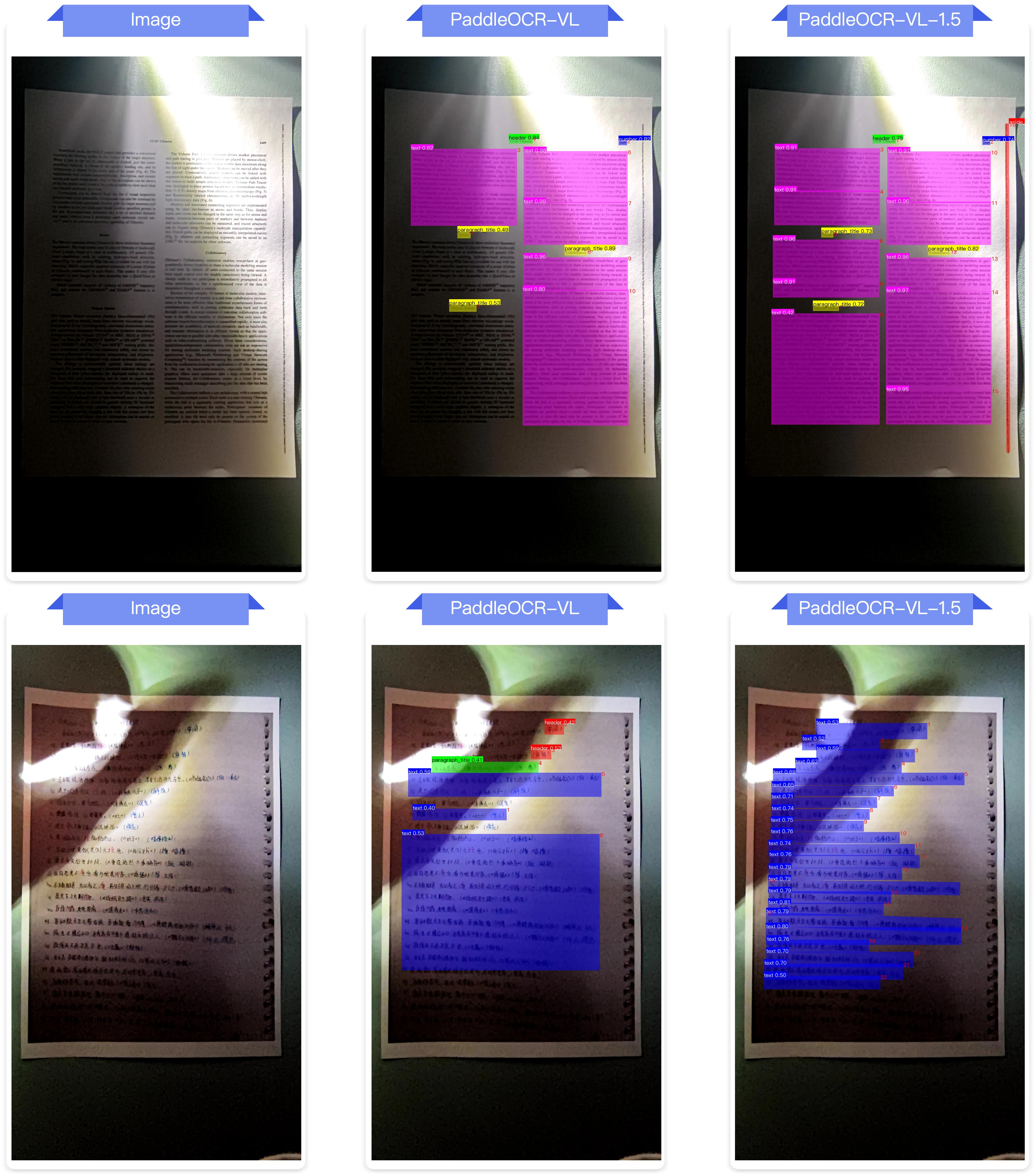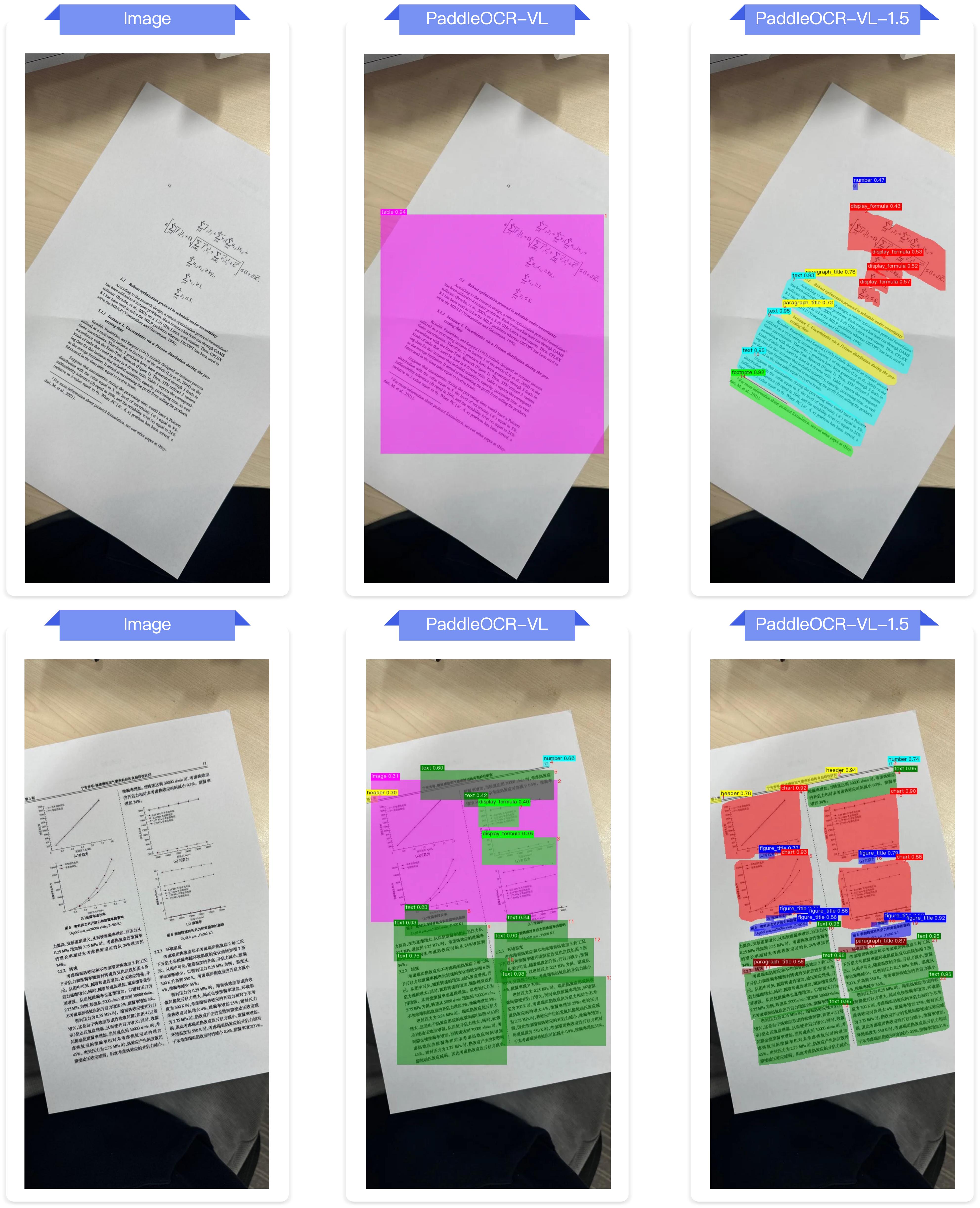 PP-DocLayoutV3 is specifically engineered to handle non-planar document images. It can directly predict multi-point bounding boxes for layout elements—as opposed to standard two-point boxes—and determine logical reading orders for skewed and curved surfaces within a single forward pass, significantly reducing cascading errors. This model is an essential component of PaddleOCR-VL-1.5, providing crucial layout analysis for the high-precision parsing of various real-world documents in PaddleOCR-VL.