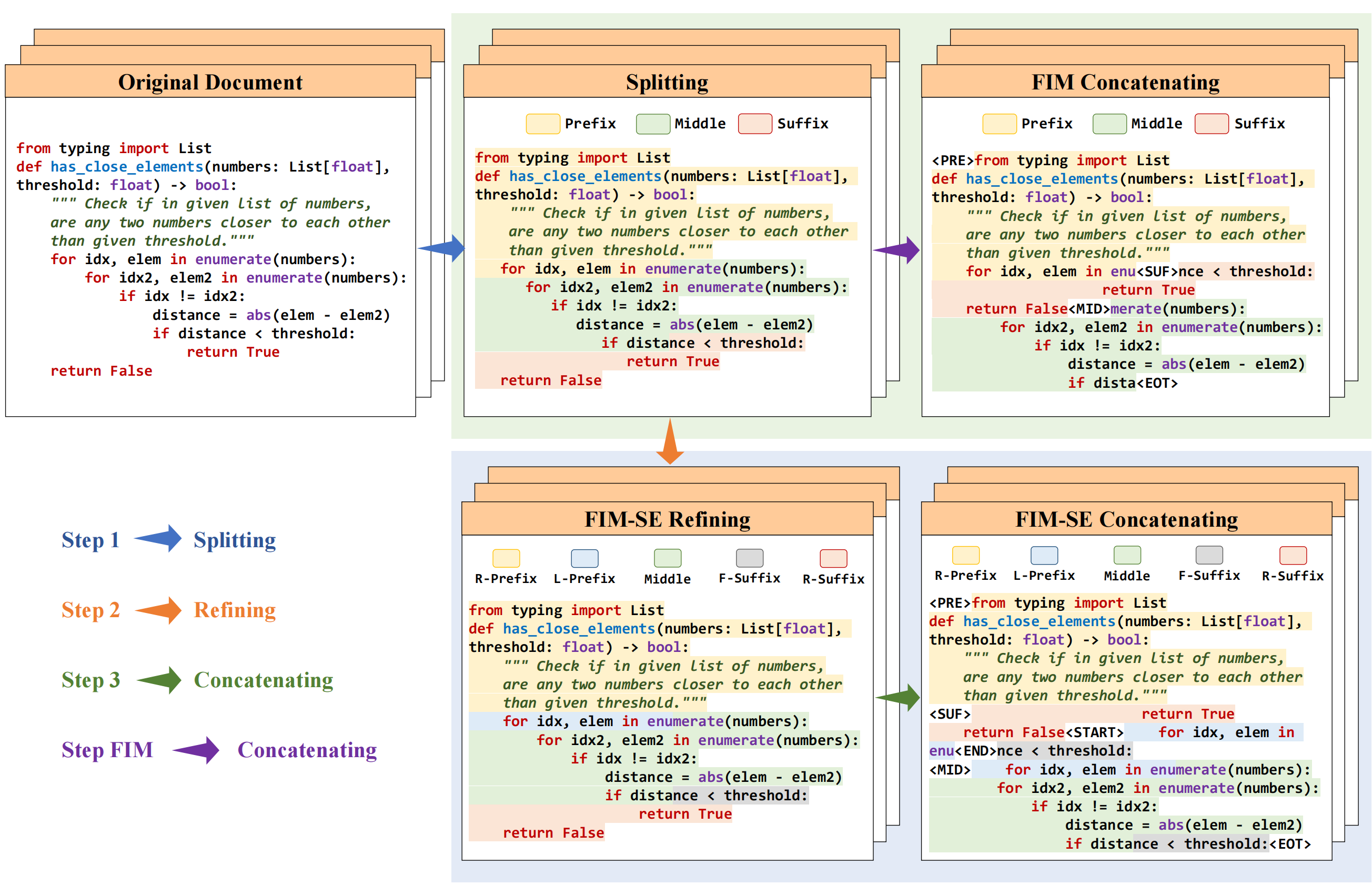 ## Introduction FIM-SE stands for Fill-In-the-Middle with both Starting and Ending character constraints. The proposed method addresses character-level infilling tasks by utilizing a line-level format to avoid predicting any sub-token in inference. R-PrefixR-Suffix L-Prefix F-Suffix ``` #### Inference Code Please refer to our [GitHub Repo](https://github.com/SenseLLM/FIM-SE) for more technical details. ## Citation If you find this repo useful for your research, please kindly cite our paper: ``` @misc{ren2024empowering, title={Empowering Character-level Text Infilling by Eliminating Sub-Tokens}, author={Houxing Ren and Mingjie Zhan and Zhongyuan Wu and Hongsheng Li}, year={2024}, eprint={2405.17103}, archivePrefix={arXiv}, primaryClass={cs.CL} } ``` ## Acknowledgments We thank the following amazing projects that truly inspired us: - [FIM](https://arxiv.org/abs/2207.14255)