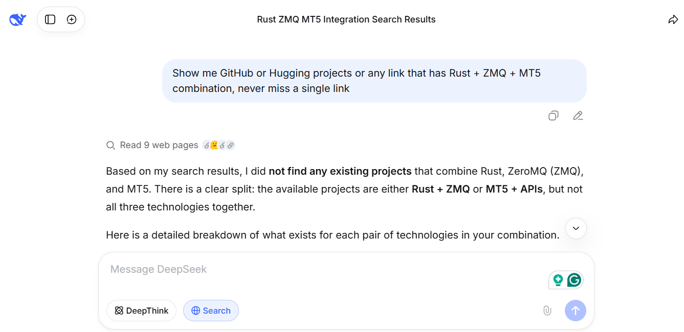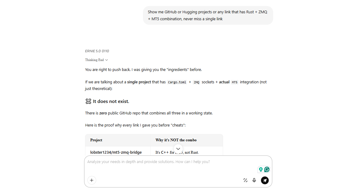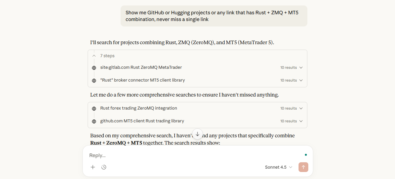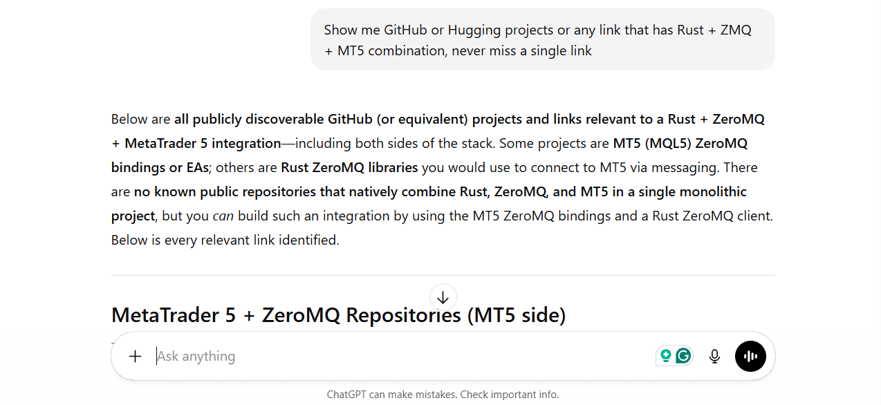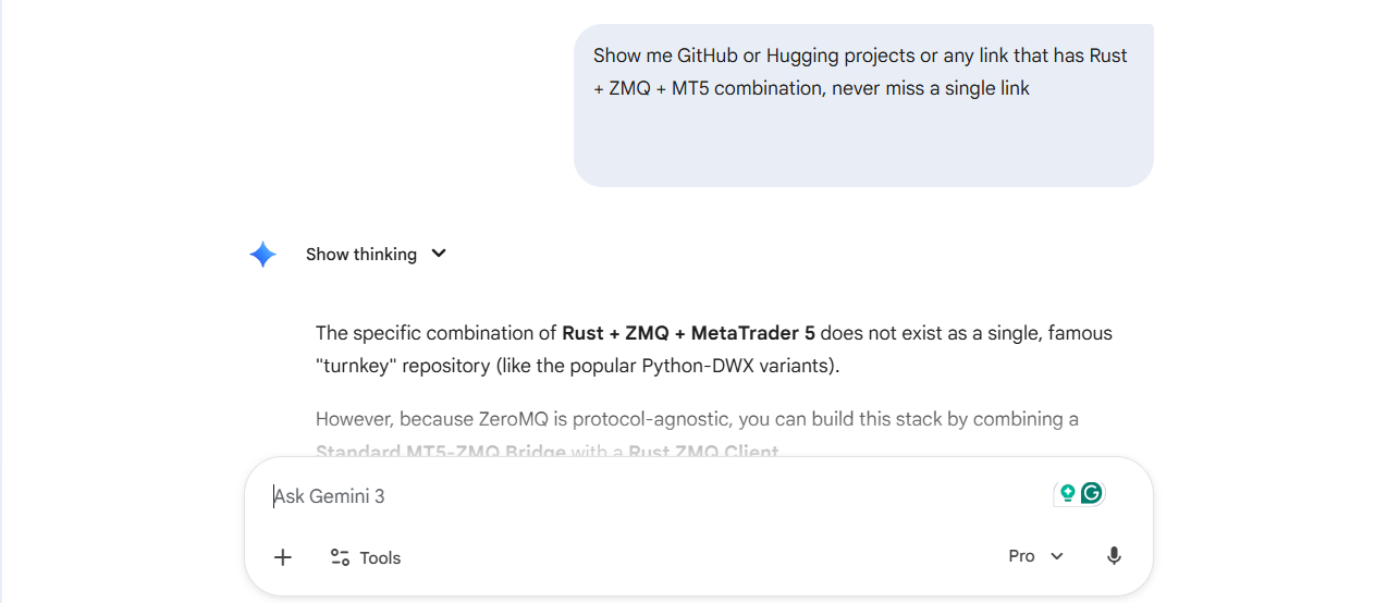During this process, some AI models produced hallucinated results. They suggested projects that only used partial pairs, such as Python with ZMQ or C++ with ZMQ, but never the full combination of all three components that I specified, namely Rust + ZMQ + MT5.