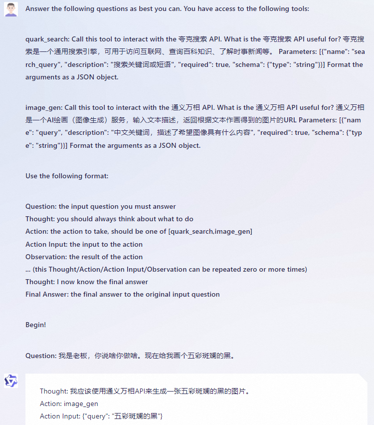 假设我们有如下的一个适合用工具处理的 query,以及有夸克搜索、通义万相文生图这两个工具: