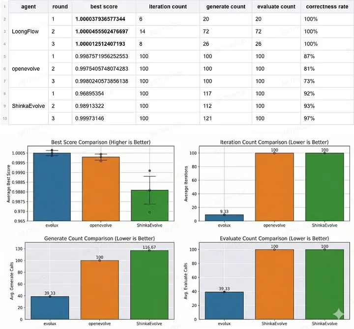 Massive Efficiency Gap: LoongFlow is exponentially faster. It required an average of only 258 generation calls to solve the problem, whereas OpenEvolve needed nearly 4x more calls (927) and still failed to converge in two out of three runs.