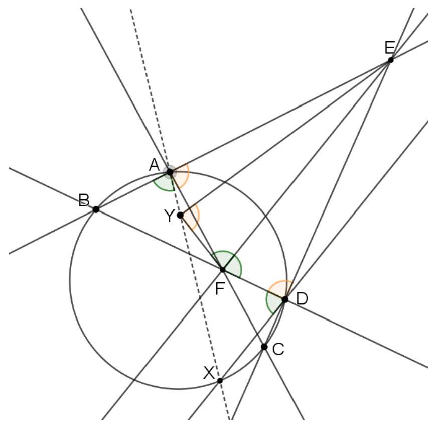 {"year": "2021", "tier": "T2", "problem_label": "4", "problem_type": null, "problem": "Let $A, B, C$ and $D$ be points on the circle $\\omega$ such that $A B C D$ is a convex quadrilateral. Suppose that $A B$ and $C D$ intersect at a point $E$ such that $A$ is between $B$ and $E$ and that $B D$ and $A C$ intersect at a point $F$. Let $X \\neq D$ be the point on $\\omega$ such that $D X$ and $E F$ are parallel. Let $Y$ be the reflection of $D$ through $E F$ and suppose that $Y$ is inside the circle $\\omega$.\n\nShow that $A, X$, and $Y$ are collinear.", "solution": "s", "metadata": {"resource_path": "Nordic_MO/segmented/en-2021-sol.jsonl", "problem_match": "\n\nProblem 4.", "solution_match": "\n## Solution"}}