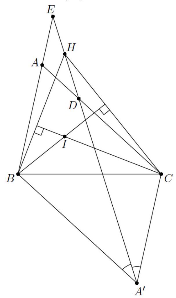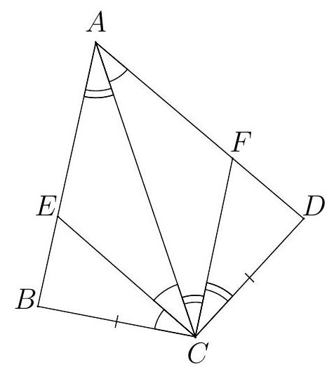 {"year": "2019", "tier": "T2", "problem_label": "4", "problem_type": null, "problem": "Let $n$ be an integer with $n \\geq 3$ and assume that $2 n$ vertices of a regular $(4 n+1)$-gon are coloured. Show that there must exist three of the coloured vertices forming an isosceles triangle.", "solution": "Let the angle bisectors from angle $C$ in triangle $A C B$ and $A C D$ intersect $A B$ and $A D$ in points $E$ and $F$ respectively. From $\\angle A C E=\\angle C A D$ it follows that $C E$ and $A D$ are parallel. Similarly $C F$ and $A B$ are parallel. Hence $A E C F$ is a parallelogram. From this it follows that $\\angle B E C=\\angle B A D=\\angle C F D$.\n\n\n\nThe angle bisector theorem yields\n\n$$\n\\frac{B E}{C F}=\\frac{B E}{A E}=\\frac{C B}{C A}=\\frac{C D}{C A}=\\frac{D F}{A F}=\\frac{D F}{C E}\n$$\n\nwhich gives\n\n$$\n|B E| \\cdot|C E|=|D F| \\cdot|C F| \\text {. }\n$$\n\nBy the sine area formula we obtain that $B C E$ have $D C F$ have equal area. Hence triangles $B C A$ and $D C A$ also have equal areal. By the sine area formula we now get\n\n$$\n\\sin (\\angle A C B)=\\sin (\\angle D C A)\n$$\n\nSince $A B C D$ is a quadrilateral, $\\angle A C B+\\angle D C A \\neq 180$ and hence we conclude from the above that $\\angle C A B=\\angle C A D$.", "metadata": {"resource_path": "Nordic_MO/segmented/en-2019-sol.jsonl", "problem_match": "\n\nProblem 4", "solution_match": "\n\nSolution 3"}}