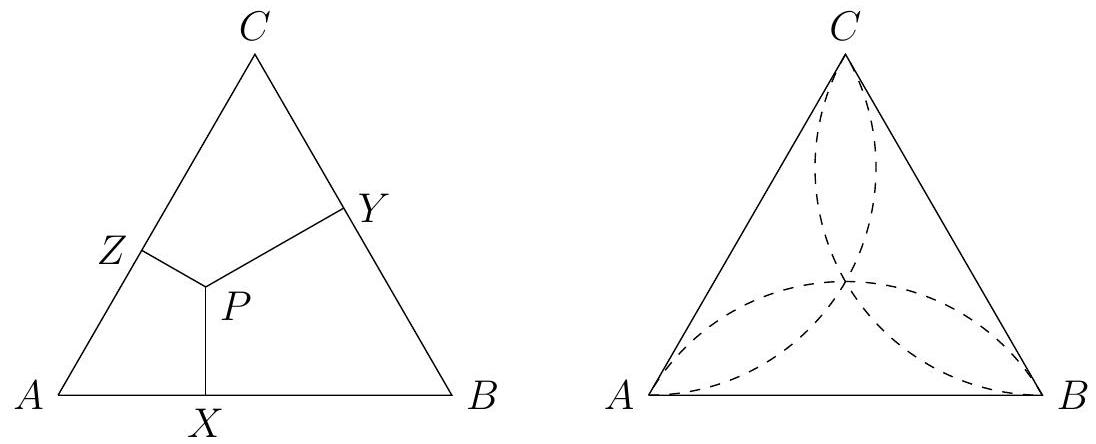 {"year": "2014", "tier": "T2", "problem_label": "2", "problem_type": null, "problem": "Given an equilateral triangle, find all points inside the triangle such that the distance from the point to one of the sides is equal to the geometric mean of the distances from the point to the other two sides of the triangle.\n\n[The geometric mean of two numbers $x$ and $y$ equals $\\sqrt{x y}$.]", "solution": "Let $P$ be a point inside $\\triangle A B C$. Denote its orthogonal projections on $A B, B C, C A$ by $X, Y, Z$, respectively. We have $\\angle X P Z=\\angle Y P X=120^{\\circ}$.\n\nAssume that $P X^{2}=P Y \\cdot P Z$. Together with $\\angle X P Z=\\angle Y P X=120^{\\circ}$, this gives $\\triangle X P Z \\sim \\triangle Y P X$ (s-a-s). It means that $\\angle P Z X=\\angle P X Y$. The quadrilaterals $A X P Z$ and $B Y P X$ are circumscribed, and we get $\\angle P A X=\\angle P B Y$, so that $\\angle P A B+\\angle P B A=60^{\\circ}$. We now have $\\angle A P B=120^{\\circ}$, meaning that $P$ lies on an arc inside the triangle, which is part of the circle through $A, B$, and the centre of the triangle.\n\nThe above argument can be reversed to see that all points on this arc satisfy the condition.\n\nThe set of all points as described is thus the union of three arcs, each of them passing through two of the vertices and through the centre of the triangle.\n\n\nRemark: It is also possible to solve this by introducing a coordinate system and deriving equations for the locus of $P$.", "metadata": {"resource_path": "Nordic_MO/segmented/en-2014-sol.jsonl", "problem_match": "\n## Problem 2", "solution_match": "2"}}