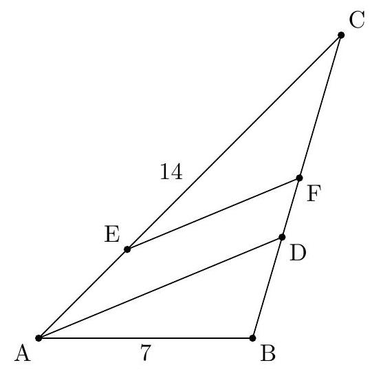 +Solution 1: Rotate $\triangle A B C$ around $A$ to $\triangle A B^{\prime} C^{\prime}$, such that $B^{\prime}$ is on segment $A F$. Note that as $B D \| E F, A B=A D$. From this, $A B^{\prime}=A B=A D$, and $B^{\prime}=D$. Note that