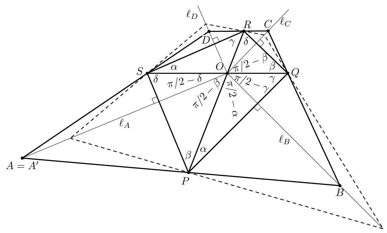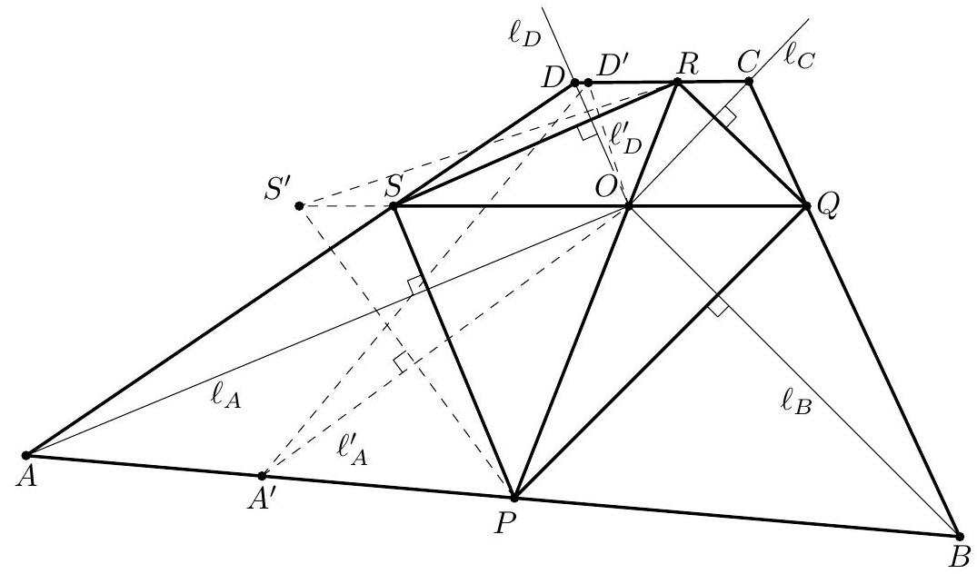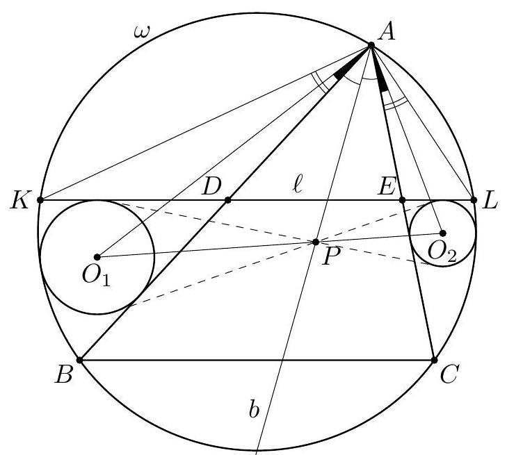 {"year": "2011", "problem_label": "3", "tier": 1, "problem": "A triangle $A B C$ is inscribed in a circle $\\omega$. A variable line $\\ell$ chosen parallel to $B C$ meets segments $A B$, $A C$ at points $D, E$ respectively, and meets $\\omega$ at points $K, L$ (where $D$ lies between $K$ and $E$ ). Circle $\\gamma_{1}$ is tangent to the segments $K D$ and $B D$ and also tangent to $\\omega$, while circle $\\gamma_{2}$ is tangent to the segments $L E$ and $C E$ and also tangent to $\\omega$. Determine the locus, as $\\ell$ varies, of the meeting point of the common inner tangents to $\\gamma_{1}$ and $\\gamma_{2}$.\n(Russia) VASily Mokin \\& Fedor IvLev", "solution": "Let $P$ be the meeting point of the common inner tangents to $\\gamma_{1}$ and $\\gamma_{2}$. Also, let $b$ be the angle bisector of $\\angle B A C$. Since $K L \\| B C, b$ is also the angle bisector of $\\angle K A L$.\n\nLet $\\mathfrak{H}$ be the composition of the symmetry $\\mathfrak{S}$ with respect to $b$ and the inversion $\\mathfrak{I}$ of centre $A$ and ratio $\\sqrt{A K \\cdot A L}$ (it is readily seen that $\\mathfrak{S}$ and $\\mathfrak{I}$ commute, so since $\\mathfrak{S}^{2}=\\mathfrak{I}^{2}=$ id, then also $\\mathfrak{H}^{2}=\\mathrm{id}$, the identical transformation). The elements of the configuration interchanged by $\\mathfrak{H}$ are summarized in Table I.\n\nLet $O_{1}$ and $O_{2}$ be the centres of circles $\\gamma_{1}$ and $\\gamma_{2}$. Since the circles $\\gamma_{1}$ and $\\gamma_{2}$ are determined by their construction (in a unique way), they are interchanged by $\\mathfrak{H}$, therefore the rays $A O_{1}$ and $A O_{2}$ are symmetrical with respect\nto $b$. Denote by $\\rho_{1}$ and $\\rho_{2}$ the radii of $\\gamma_{1}$ and $\\gamma_{2}$. Since $\\angle O_{1} A B=\\angle O_{2} A C$, we have $\\rho_{1} / \\rho_{2}=A O_{1} / A O_{2}$. On the other hand, from the definition of $P$ we have $O_{1} P / O_{2} P=$ $\\rho_{1} / \\rho_{2}=A O_{1} / A O_{2}$; this means that $A P$ is the angle bisector of $\\angle O_{1} A O_{2}$ and therefore of $\\angle B A C$.\n\nThe limiting, degenerated, cases are when the parallel line passes through $A$ - when $P$ coincides with $A$; respectively when the parallel line is $B C$ - when $P$ coincides with the foot $A^{\\prime} \\in B C$ of the angle bisector of $\\angle B A C$ (or any other point on $B C$ ). By continuity, any point $P$ on the open segment $A A^{\\prime}$ is obtained for some position of the parallel, therefore the locus is the open segment $A A^{\\prime}$ of the angle bisector $b$ of $\\angle B A C$.\n\n| point $K$ | $\\longleftrightarrow$ | point $L$ |\n| :---: | :---: | :---: |\n| line $K L$ | $\\longleftrightarrow$ | circle $\\omega$ |\n| ray $A B$ | $\\longleftrightarrow$ | ray $A C$ |\n| point $B$ | $\\longleftrightarrow$ | point $E$ |\n| point $C$ | $\\longleftrightarrow$ | point $D$ |\n| segment $B D$ | $\\longleftrightarrow$ | segment $E C$ |\n| $\\operatorname{arc} B K$ | $\\longleftrightarrow$ | segment $E L$ |\n| $\\operatorname{arc} C L$ | $\\longleftrightarrow$ | segment $D K$ |\n\n\n\nTABLE I: Elements interchanged by $\\mathfrak{H}$.", "problem_match": "\nProblem 3.", "solution_match": "\nSolution."}