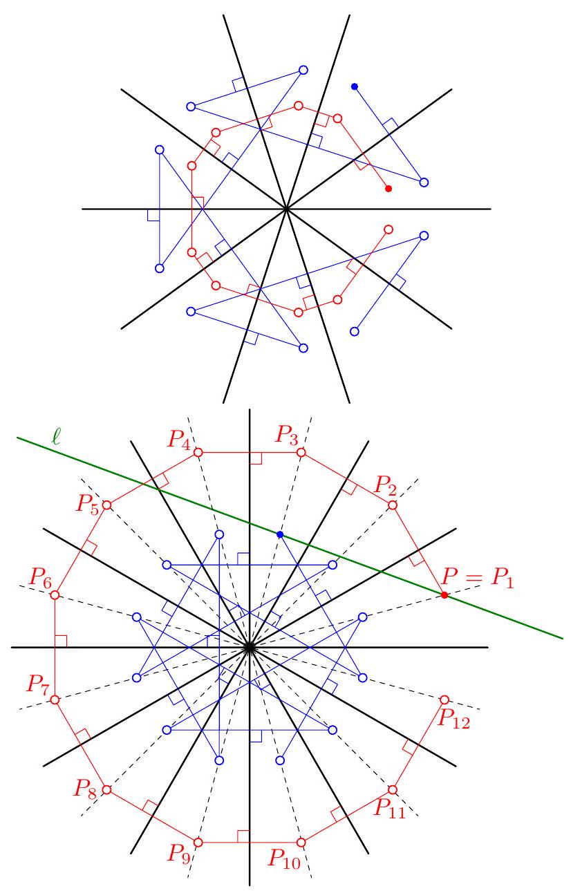 {"year": "2011", "problem_label": "5", "tier": 1, "problem": "For every $n \\geq 3$, determine all the configurations of $n$ distinct points $X_{1}, X_{2}, \\ldots, X_{n}$ in the plane, with the property that for any pair of distinct points $X_{i}, X_{j}$ there exists a permutation $\\sigma$ of the integers $\\{1, \\ldots, n\\}$, such that $\\mathrm{d}\\left(X_{i}, X_{k}\\right)=\\mathrm{d}\\left(X_{j}, X_{\\sigma(k)}\\right)$ for all $1 \\leq k \\leq n$.\n(We write $\\mathrm{d}(X, Y)$ to denote the distance between points $X$ and $Y$.)\n(United Kingdom) LuKe BetTs", "solution": "Let us first prove that the points must be concyclic. Assign to each point $X_{k}$ the vector $x_{k}$ in a system of orthogonal coordinates whose origin is the point of mass of the configuration, thus $\\frac{1}{n} \\sum_{k=1}^{n} x_{k}=0$.\n\nThen $\\mathrm{d}^{2}\\left(X_{i}, X_{k}\\right)=\\left\\|x_{i}-x_{k}\\right\\|^{2}=\\left\\langle x_{i}-x_{k}, x_{i}-x_{k}\\right\\rangle=$ $\\left\\|x_{i}\\right\\|^{2}-2\\left\\langle x_{i}, x_{k}\\right\\rangle+\\left\\|x_{k}\\right\\|^{2}$, hence $\\sum_{k=1}^{n} \\mathrm{~d}^{2}\\left(X_{i}, X_{k}\\right)=n\\left\\|x_{i}\\right\\|^{2}-$\n$2\\left\\langle x_{i}, \\sum_{k=1}^{n} x_{k}\\right\\rangle+\\sum_{k=1}^{n}\\left\\|x_{k}\\right\\|^{2}=n\\left\\|x_{i}\\right\\|^{2}+\\sum_{k=1}^{n}\\left\\|x_{k}\\right\\|^{2}=n\\left\\|x_{j}\\right\\|^{2}+$ $\\sum_{k=1}^{n}\\left\\|x_{\\sigma(k)}\\right\\|^{2}=\\sum_{k=1}^{n} \\mathrm{~d}^{2}\\left(X_{j}, X_{\\sigma(k)}\\right)$, therefore $\\left\\|x_{i}\\right\\|=\\left\\|x_{j}\\right\\|$ for all pairs $(i, j)$. The points are thus concyclic (lying on a circle centred at $O(0,0)$ ).\nLet now $m$ be the least angular distance between any two points. Two points situated at angular distance $m$ must be adjacent on the circle. Let us connect each pair of such two points with an edge. The graph $G$ obtained must be regular, of degree $\\operatorname{deg}(G)=1$ or 2 . If $n$ is odd, since $\\sum_{k=1}^{n} \\operatorname{deg}\\left(X_{k}\\right)=$ $n \\operatorname{deg}(G)=2|E|$, we must have $\\operatorname{deg}(G)=2$, hence the configuration is a regular $n$-gon.\n\nIf $n$ is even, we may have the configuration of a regular $n$-gon, but we also may have $\\operatorname{deg}(G)=1$. In that case, let $M$ be the next least angular distance between any two points; such points must also be adjacent on the circle. Let us connect each pair of such two points with an edge, in order to get a graph $G^{\\prime}$. A similar reasoning yields $\\operatorname{deg}\\left(G^{\\prime}\\right)=1$, thus the configuration is that of an equiangular $n$-gon (with alternating equal side-lengths).", "problem_match": "\nProblem 5.", "solution_match": "\nSolution."}