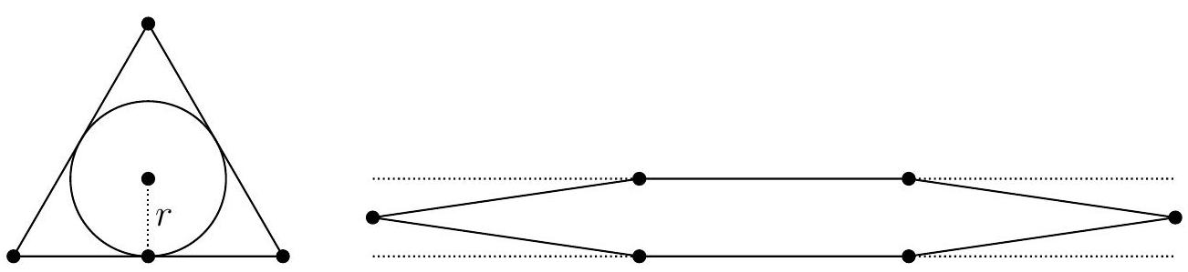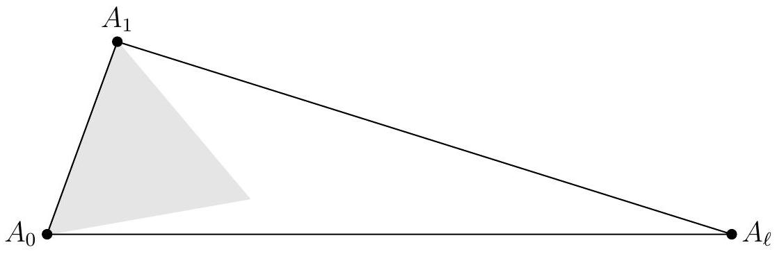 {"year": "2021", "problem_label": "7", "tier": 1, "problem": "Trouver tous les entiers $n \\geqslant 3$ pour lesquels tout $n$-gone convexe dont les côtés sont de longueur 1 contient un triangle équilatéral de côté 1.", "solution": "Tout d'abord, nul entier $n$ pair ne figure parmi les entiers recherchés. En effet, le cercle inscrit d'un triangle équilatéral de côté 1 a pour aire $\\mathcal{A}=\\sqrt{3} / 4$ et pour rayon $r=2 \\mathcal{A} / 3=\\sqrt{3} / 6$. Par conséquent, l'amande ci-dessous, dessinée dans le cas où $n=6$, et elle-même contenue dans une bande de largeur $r$, ne saurait contenir de tel triangle équilatéral.\n\n\nRéciproquement, soit $n \\geqslant 3$ un entier pour lequel il existe un polygone $\\mathcal{P}=A_{0} A_{1} \\ldots A_{n-1}$, convexe de côté 1 , tel que décrit dans l'énoncé, et qui ne contient aucun triangle équilatéral de côté 1 . On suppose que ses sommets ont été listés dans le sens des aiguilles d'une montre. En s'inspirant de la construction ci-dessus, on note $d$ la distance maximale entre deux points de $\\mathcal{P}$ et, sans perte de généralité, on suppose qu'il existe un point $A_{\\ell}$, avec $1 \\leqslant \\ell \\leqslant k$, situé à distance $d$ de $A_{0}$.\nSi $d=1$, le polygone $\\mathcal{P}$ est contenu dans la zone grise représentée ci-dessous, qui consiste en l'intersection de deux demi-cercles de rayon 1 . Comme $A_{2}$ est à distance 1 de $A_{1}$, il se trouve sur l'arc de cercle $\\widehat{B A_{0}}$ et, de même, $A_{n-1}$ se trouve sur l'arc de cercle $\\widehat{A_{1} B}$. Comme $\\mathcal{P}$ est convexe, on en déduit que $A_{2}=B=A_{n-1}$, donc que $\\mathcal{P}$ est un triangle équilatéral, qui se contient bien sûr lui-même.\n\n\nOn sait donc que $d>1$, de sorte que que $A_{0} A_{\\ell}$ est une diagonale de $\\mathcal{P}$. Si $\\widehat{A_{\\ell} A_{0} A_{1}} \\geqslant 60^{\\circ}$, et puisque $A_{1} A_{\\ell} \\leqslant d=A_{0} A_{\\ell}$, on sait que $\\widehat{A_{0} A_{1} A_{\\ell}} \\geqslant \\widehat{A_{\\ell} A_{0} A_{1}} \\geqslant 60^{\\circ}$, de sorte que le triangle $A_{0} A_{1} A_{\\ell}$ lui-même contient un triangle équilatéral de côté 1 , comme illustré ci-dessous.\n\n\nAinsi, $\\widehat{A_{\\ell} A_{0} A_{1}}<60^{\\circ}$ et, de même, $\\widehat{A_{\\ell-1} A_{\\ell}} A_{0}<60^{\\circ}$. On dessine alors le trapèze isocèle $\\mathcal{T}=A_{0} B_{0} B_{\\ell} A_{\\ell}$ représenté ci-dessous dans le cas où $\\ell=4$, d'angles $60^{\\circ}$ en $A_{0}$ et $A_{\\ell}$ et de côtés $A_{0} B_{0}=A_{\\ell} B_{\\ell}=1$. S'il existe un point $A_{i}$ (avec $1 \\leqslant i \\leqslant \\ell-1$ ) situé en-dehors de $\\mathcal{T}$, le polygone $\\mathcal{P}$ contient de nouveau un triangle équilatéral de côté 1 , comme illustré ci-dessous, en blanc sur fond gris.\n\n\nCe cas de figure ne survient donc pas non plus, de sorte que le polygone $A_{0} A_{1} \\ldots A_{\\ell}$ est strictement inclus dans le polygone $\\mathcal{T}$. Son périmètre $\\ell+d$ est donc strictement inférieur à celui de $\\mathcal{T}$, c'est-à-dire à $2 d+1$, donc $\\ell-1<d$, et l'inégalité triangulaire indique également que $d \\leqslant \\ell$, ce qui signifie que $\\ell=\\lceil d\\rceil$. En considérant le polygone $A_{0} A_{n} A_{n-1} \\ldots A_{\\ell}$, on constate de même que $n-\\ell=\\lceil d\\rceil$, de sorte que $n=2\\lceil d\\rceil$ est nécessairement pair.\nAinsi, les entiers recherchés sont les entiers impairs.\nRemarque: Nous avons affirmé ci-dessus que, lorsqu'un polygone convexe $\\mathcal{P}$ est strictement inclus dans un polygone $\\mathcal{Q}$, le périmètre de $\\mathcal{P}$ est strictement inférieur à celui de $\\mathcal{Q}$. Cette affirmation «classique» ce démontre comme suit.\nTout d'abord, soit $\\mathcal{C}$ l'enveloppe convexe de $\\mathcal{Q}$. Par construction, son périmètre est inférieur ou égal à celui de $\\mathcal{Q}$, et on peut donc supposer sans perte de généralité que $\\mathcal{Q}$ est convexe.\nDans la suite, on suppose $\\mathcal{Q}$ fixé, puis on note $\\mathrm{p}(\\mathcal{P})$ le périmètre d'un polygone $\\mathcal{P}$ et $\\mathrm{c}(\\mathcal{P})$ le nombre de côtés de $\\mathcal{P}$ qui ne sont pas inclus dans des côtés de $\\mathcal{Q}$. On démontre alors par récurrence sur $c(\\mathcal{P})$ que $p(\\mathcal{P}) \\leqslant p(\\mathcal{Q})$.\nÉtant donné un polygone $\\mathcal{P}$ strictement inclus dans $\\mathcal{Q}$, on sait que $c(\\mathcal{P}) \\geqslant 1$, et on considère un côté $[B C]$ de $\\mathcal{P}$ qui n'est pas inclus dans un côté de $\\mathcal{Q}$. Puisque $\\mathcal{Q}$ est convexe, ce côté est strictement inclus dans $\\mathcal{Q}$. Puis, comme illustré ci-dessous, on prolonge les demi-droites $[A B)$ et $[D C)$ jusqu'à l'infini, où jusqu'à ce qu'elles se rencontrent. On définit ainsi une zone finie ou infinie, que l'on note $\\mathcal{Z}$, et qui est susceptible d'être bornée ou non.\n\n\nCas 1\n\n\nCas 2\n\n\nCas 3\n\nOn intègre alors au polygone $\\mathcal{P}$ la portion du polygone $\\mathcal{Q}$ incluse dans la zone $\\mathcal{Z}$, que nous avons représentée en bleu. On forme ainsi un nouveau polygone convexe $\\mathcal{P}^{\\prime}$. Puisque le côté $[B C]$ de $\\mathcal{P}$ a disparu, on sait que $\\mathrm{c}\\left(\\mathcal{P}^{\\prime}\\right)<\\mathrm{c}(\\mathcal{P})$. L'hypothèse de récurrence et l'inégalité triangulaire indiquent alors que $\\mathrm{p}(\\mathcal{P})<\\mathrm{p}\\left(\\mathcal{P}^{\\prime}\\right) \\leqslant \\mathrm{p}(\\mathcal{Q})$, ce qui conclut.\n\nCommentaire des correcteurs Ce problème était extrêmement difficile, au point qu'un seul élève a eu plus de deux points (et l'a résolu). De nombreux élèves ont eu l'excellente idée d'utiliser une amande allongée pour traiter le cas $n$ pair. L'idée principale, difficile à trouver, était alors de continuer sur une construction analogue en considérant l'allongement d'un polygone, 