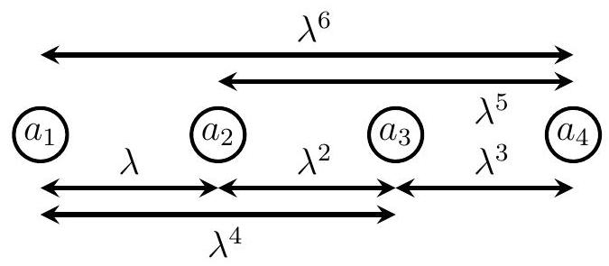 {"year": "2022", "problem_label": "7", "tier": 1, "problem": "Trouver tous les entiers $n \\geqslant 2$ pour lesquels il existe un nombre réel $r>0$ et $n$ nombres réels $a_{1}<a_{2}<\\cdots<a_{n}$ tels que les $n(n-1) / 2$ différences $a_{j}-a_{i}$ obtenues lorsque $1 \\leqslant i<j \\leqslant n$ sont égales, à l'ordre près, aux nombres $r^{1}, r^{2}, \\ldots, r^{n(n-1) / 2}$.", "solution": "Dans un tel problème, il est indispensable de commencer par étudier les petits cas.\n$\\triangleright$ Lorsque $n=2$, il suffit de choisir $a_{1}=0$ et $a_{2}=r=1$. Par conséquent, $n=2$ convient.\n$\\triangleright$ Lorsque $n=3$, il suffit de choisir $a_{1}=0, a_{2}=r=\\phi$ et $a_{3}=\\phi^{3}$, où $\\phi=(1+\\sqrt{5}) / 2$ est le nombre d'or et vérifie l'égalité $\\phi^{2}=1+\\phi$. En effet, on a alors $a_{2}-a_{1}=\\phi$, $a_{3}-a_{2}=\\phi\\left(\\phi^{2}-1\\right)=\\phi^{2}$ et $a_{3}-a_{1}=\\phi^{3}$, comme illustré ci-dessous à gauche. Par conséquent, $n=3$ convient.\n$\\triangleright$ Lorsque $n=4$, il suffit de choisir $a_{1}=0, a_{2}=\\lambda, a_{3}=\\lambda^{4}, a_{4}=\\lambda^{6}$ et $r=\\lambda$, où $\\lambda$ est une racine positive du polynôme $P(X)=X^{3}-X-1$, pour lequel $P(1)<0<P(2)$. En effet, on a alors $a_{2}-a_{1}=\\lambda, a_{3}-a_{2}=\\lambda\\left(\\lambda^{3}-1\\right)=\\lambda^{2}, a_{4}-a_{3}=\\lambda^{3}\\left(\\lambda^{3}-\\lambda\\right)=\\lambda^{3}, a_{3}-a_{1}=\\lambda^{4}$, $a_{4}-a_{2}=\\left(a_{4}-a_{3}\\right)=\\left(a_{3}-a_{2}\\right)=\\lambda^{3}+\\lambda^{2}=\\lambda\\left(\\left(a_{3}-a_{2}\\right)+\\left(a_{2}-a_{1}\\right)\\right)=\\lambda\\left(a_{3}-a_{1}\\right)=\\lambda^{5}$, et enfin $a_{3}-a_{1}=\\lambda^{6}$, comme illustré ci-dessous à droite. Par conséquent, $n=4$ convient.\n\n\nCas $n=3$\n\n\nCas $n=4$\n\nEn pratique, on pouvait trouver les constructions ci-dessus par étude exhaustive des valeurs possibles pour les différences $a_{j}-a_{i}$. Cependant, lorsque $n \\geqslant 5$, on n'a guère envie de continuer sur cette lancée avec $n(n-1) / 2 \\geqslant 10$ différences à traiter. On suppose donc que l'on dispose d'une solution $n \\geqslant 5$, ainsi que de réels $r>0$ et $a_{1}<a_{2}<\\cdots<a_{n}$ adéquats.\nPosons $t=n(n-1) / 2$. Quitte à remplacer $r$ par $1 / r$ et chaque nombre $a_{i}$ par $a_{i} / r^{t+1}$, on suppose que $r \\geqslant 1$. En outre, puisque $a_{3}-a_{1}>a_{2}-a_{1}$, on sait même que $r>1$. Désormais, à chaque entier $k \\leqslant t$, on associe l'intervalle $\\mathcal{I}(k)=\\{i, i+1, \\ldots, j-1\\}$ pour lequel $a_{j}-a_{i}=r^{k}$. Lorsque l'on scinde un intervalle $\\mathcal{I}(k)$ en deux sous-intervalles $\\mathcal{I}(\\ell)$ et $\\mathcal{I}\\left(\\ell^{\\prime}\\right)$, on constate immédiatement que $r^{k}=r^{\\ell}+r^{\\ell^{\\prime}}$.\nSupposons maintenant qu'il existe un entier $k$ pour lequel l'ensemble $\\mathcal{I}(k) \\cup \\mathcal{I}(k+1)$ n'est pas un intervalle. Quitte à remplacer chaque nombre $a_{i}$ par $-a_{i}$, il existe quatre entiers $u<v<w<x$ tels que $r^{k}=a_{v}-a_{u}$ et $r^{k+1}=a_{x}-a_{w}$. Soit alors $x, y$ et $z$ les entiers tels que $r^{x}=a_{w}-a_{v}, r^{y}=a_{w}-a_{u}$ et $r^{z}=a_{x}-a_{v}$. Comme $r^{y}=r^{k}+r^{x}<r^{k+1}+r^{x}=r^{z}$, on sait que $z \\geqslant y+1$, de sorte que $r^{k+1}+r^{x}=r^{z} \\geqslant r^{y+1}=r^{k+1}+r^{x+1}$, ce qui est absurde. Ainsi, l'ensemble $\\mathcal{I}(k) \\cup \\mathcal{I}(k+1)$ est toujours un intervalle.\n\n\nPar ailleurs, la bijection réciproque $\\mathcal{I}^{-1}$ de $\\mathcal{I}$ est croissante : lorsque $\\mathcal{I}(k) \\subseteq \\mathcal{I}(\\ell)$, on sait que $k \\leqslant \\ell$. Par conséquent, et quitte à remplacer chaque terme $a_{i}$ par $-a_{i}$, les intervalles $\\mathcal{I}(1)$ et $\\mathcal{I}(2)$ sont sont des singletons voisins, de la forme $\\{k\\}$ et $\\{k+1\\}$.\n\nSoit $\\ell$ le plus grand entier pour lequel $\\mathcal{I}(\\ell+1)=\\{k+\\ell\\}$. L'intervalle $\\mathcal{I}(\\ell+2)$ ne peut contenir, parmi éventuels ses sous-intervalles stricts, que les singletons $\\{k\\},\\{k+1\\}, \\ldots,\\{k+\\ell\\}$. En outre, $\\mathcal{I}(\\ell+2)$ ne coïncide avec aucun des singletons $\\{k\\},\\{k+1\\}, \\ldots,\\{k+\\ell+1\\}$. Or, $\\mathcal{I}(\\ell+2) \\cup$ $\\{k+\\ell\\}$ est un intervalle, donc $\\mathcal{I}(\\ell+2)$ contient l'un des trois entiers $k+\\ell-1, k+\\ell$ et $k+\\ell+1$. Par conséquent, il existe un entier $a$, égal à $\\ell-2$ ou à $\\ell-1$, tel que $\\mathcal{I}(\\ell+2)=\\{k+a, k+a+1\\}$. On note alors $\\ell^{\\prime}$ l'entier $^{-1}(\\{k, k+1\\})$. Puisque $r^{1}+r^{2}=r^{\\ell^{\\prime}} \\geqslant r^{\\ell}=r^{a+1}+r^{a+2}$, on sait que $a=0$. Ainsi, $\\mathcal{I}(\\ell+2)=\\{k, k+1\\}$ et $\\ell$ est égal à 1 ou à 2 .\n$\\triangleright \\mathrm{Si} \\ell=1$, alors $r+r^{2}=r^{3}$. Cette situation est pour l'instant analogue au cas $n=2$.\nEn outre, l'intervalle $\\mathcal{I}(4)$ est un singleton $\\{k-1\\}$ ou $\\{k+2\\}$, et sa réunion disjointe avec $\\mathcal{I}(3)$ forme un intervalle $\\mathcal{I}(m)$ égal à $\\{k-1, k, k+1\\}$ ou à $\\{k, k+1, k+2\\}$, pour lequel $r^{m}=r^{3}+r^{4}=r^{2}\\left(r+r^{2}\\right)=r^{5}$. Mais alors $\\mathcal{I}(5)$ compte 6 sous-intervalles, ce qui est impossible.\n$\\triangleright \\mathrm{Si} \\ell=2$, alors $r+r^{2}=r^{4}$. On en déduit immédiatement que $r^{2}+r^{3}=r^{5}$ et $r^{3}+r^{4}=r^{6}$, donc que $\\mathcal{I}(5)=\\{k+1, k+2\\}$ et $\\mathcal{I}(6)=\\{k, k+1, k+2\\}$. Cette situation est pour l'instant analogue au cas $n=3$.\nAinsi, l'intervalle $\\mathcal{I}(7)$ est un singleton $\\{k-1\\}$ ou $\\{k+3\\}$, et sa réunion disjointe avec $\\mathcal{I}(6)$ forme un intervalle $\\mathcal{I}(m)$ égal à $\\{k-1, k, k+1, k+2\\}$ ou à $\\{k, k+1, k+2, k+3\\}$, pour lequel $r^{m}=r^{6}+r^{7}=r^{5}\\left(r+r^{2}\\right)=r^{9}$. Par conséquent, $\\mathcal{I}(9)$ compte 10 sous-intervalles, ce qui est impossible.\n\n\nEn conclusion, nul entier $n \\geqslant 5$ ne convient, et les solutions s