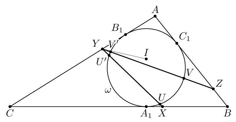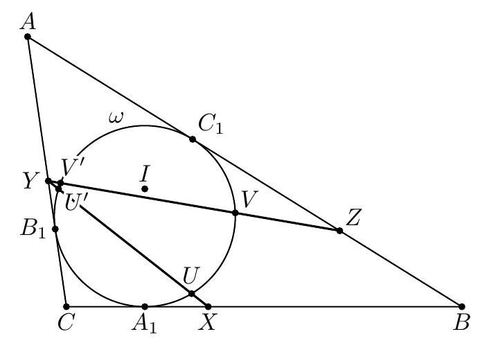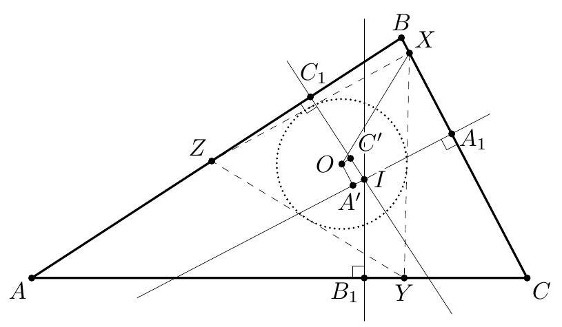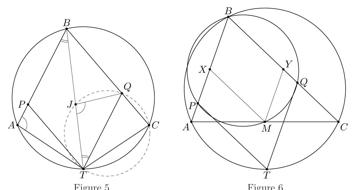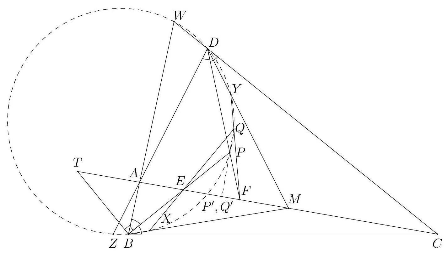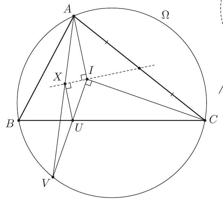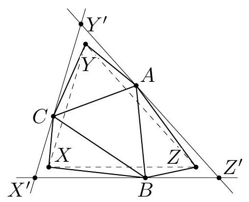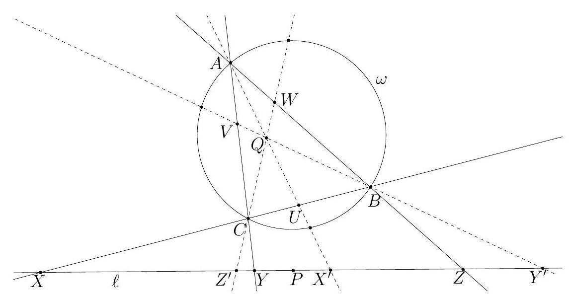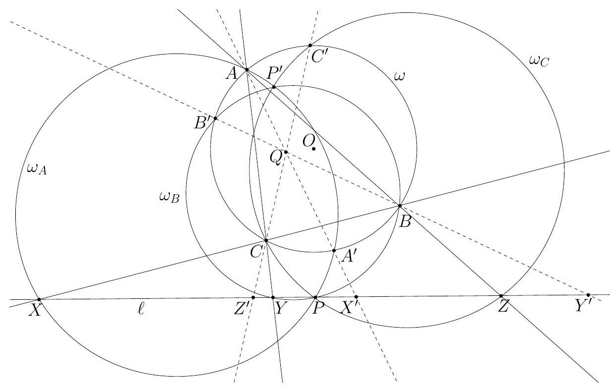 s>O^{\prime \prime} Q+O^{\prime} S, \quad O^{\prime} P+O^{\prime \prime} R=s=O^{\prime \prime} Q+O^{\prime} S . +$$ + + + +Once this is established, the proof of the original statement for $B C \| A D$ is analogous to the one in the intersecting case. One replaces products by sums of relevant segments. + +G8. Let $A B C$ be a triangle with circumcircle $\omega$ and $\ell$ a line without common points with $\omega$. Denote by $P$ the foot of the perpendicular from the center of $\omega$ to $\ell$. The side-lines $B C, C A, A B$ intersect $\ell$ at the points $X, Y, Z$ different from $P$. Prove that the circumcircles of the triangles $A X P, B Y P$ and $C Z P$ have a common point different from $P$ or are mutually tangent at $P$. + +Solution 1. Let $\omega_{A}, \omega_{B}, \omega_{C}$ and $\omega$ be the circumcircles of triangles $A X P, B Y P, C Z P$ and $A B C$ respectively. The strategy of the proof is to construct a point $Q$ with the same power with respect to the four circles. Then each of $P$ and $Q$ has the same power with respect to $\omega_{A}, \omega_{B}, \omega_{C}$ and hence the three circles are coaxial. In other words they have another common point $P^{\prime}$ or the three of them are tangent at $P$. + +We first give a description of the point $Q$. Let $A^{\prime} \neq A$ be the second intersection of $\omega$ and $\omega_{A}$; define $B^{\prime}$ and $C^{\prime}$ analogously. We claim that $A A^{\prime}, B B^{\prime}$ and $C C^{\prime}$ have a common point. Once this claim is established, the point just constructed will be on the radical axes of the three pairs of circles $\left\{\omega, \omega_{A}\right\},\left\{\omega, \omega_{B}\right\},\left\{\omega, \omega_{C}\right\}$. Hence it will have the same power with respect to $\omega, \omega_{A}, \omega_{B}, \omega_{C}$. + + + +We proceed to prove that $A A^{\prime}, B B^{\prime}$ and $C C^{\prime}$ intersect at one point. Let $r$ be the circumradius of triangle $A B C$. Define the points $X^{\prime}, Y^{\prime}, Z^{\prime}$ as the intersections of $A A^{\prime}, B B^{\prime}, C C^{\prime}$ with $\ell$. Observe that $X^{\prime}, Y^{\prime}, Z^{\prime}$ do exist. If $A A^{\prime}$ is parallel to $\ell$ then $\omega_{A}$ is tangent to $\ell$; hence $X=P$ which is a contradiction. Similarly, $B B^{\prime}$ and $C C^{\prime}$ are not parallel to $\ell$. + +From the powers of the point $X^{\prime}$ with respect to the circles $\omega_{A}$ and $\omega$ we get + +$$ +X^{\prime} P \cdot\left(X^{\prime} P+P X\right)=X^{\prime} P \cdot X^{\prime} X=X^{\prime} A^{\prime} \cdot X^{\prime} A=X^{\prime} O^{2}-r^{2} +$$ + +hence + +$$ +X^{\prime} P \cdot P X=X^{\prime} O^{2}-r^{2}-X^{\prime} P^{2}=O P^{2}-r^{2} . +$$ + +We argue analogously for the points $Y^{\prime}$ and $Z^{\prime}$, obtaining + +$$ +X^{\prime} P \cdot P X=Y^{\prime} P \cdot P Y=Z^{\prime} P \cdot P Z=O P^{2}-r^{2}=k^{2} +$$ + +In these computations all segments are regarded as directed segments. We keep the same convention for the sequel. + +We prove that the lines $A A^{\prime}, B B^{\prime}, C C^{\prime}$ intersect at one point by CEVA's theorem. To avoid distracting remarks we interpret everything projectively, i. e. whenever two lines are parallel they meet at a point on the line at infinity. + +Let $U, V, W$ be the intersections of $A A^{\prime}, B B^{\prime}, C C^{\prime}$ with $B C, C A, A B$ respectively. The idea is that although it is difficult to calculate the ratio $\frac{B U}{C U}$, it is easier to deal with the cross-ratio $\frac{B U}{C U} / \frac{B X}{C X}$ because we can send it to the line $\ell$. With this in mind we apply MEnELaus' theorem to the triangle $A B C$ and obtain $\frac{B X}{C X} \cdot \frac{C Y}{A Y} \cdot \frac{A Z}{B Z}=1$. Hence Ceva's ratio can be expressed as + +$$ +\frac{B U}{C U} \cdot \frac{C V}{A V} \cdot \frac{A W}{B W}=\frac{B U}{C U} / \frac{B X}{C X} \cdot \frac{C V}{A V} / \frac{C Y}{A Y} \cdot \frac{A W}{B W} / \frac{A Z}{B Z} +$$ + + + +Project the line $B C$ to $\ell$ from $A$. The cross-ratio between $B C$ and $U X$ equals the cross-ratio between $Z Y$ and $X^{\prime} X$. Repeating the same argument with the lines $C A$ and $A B$ gives + +$$ +\frac{B U}{C U} \cdot \frac{C V}{A V} \cdot \frac{A W}{B W}=\frac{Z X^{\prime}}{Y X^{\prime}} / \frac{Z X}{Y X} \cdot \frac{X Y^{\prime}}{Z Y^{\prime}} / \frac{X Y}{Z Y} \cdot \frac{Y Z^{\prime}}{X Z^{\prime}} / \frac{Y Z}{X Z} +$$ + +and hence + +$$ +\frac{B U}{C U} \cdot \frac{C V}{A V} \cdot \frac{A W}{B W}=(-1) \cdot \frac{Z X^{\prime}}{Y X^{\prime}} \cdot \frac{X Y^{\prime}}{Z Y^{\prime}} \cdot \frac{Y Z^{\prime}}{X Z^{\prime}} +$$ + +The equations (1) reduce the problem to a straightforward computation on the line $\ell$. For instance, the transformation $t \mapsto-k^{2} / t$ preserves cross-ratio and interchanges the points $X, Y, Z$ with the points $X^{\prime}, Y^{\prime}, Z^{\prime}$. Then + +$$ +\frac{B U}{C U} \cdot \frac{C V}{A V} \cdot \frac{A W}{B W}=(-1) \cdot \frac{Z X^{\prime}}{Y X^{\prime}} / \frac{Z Z^{\prime}}{Y Z^{\prime}} \cdot \frac{X Y^{\prime}}{Z Y^{\prime}} / \frac{X Z^{\prime}}{Z Z^{\prime}}=-1 +$$ + +We proved that CEvA's ratio equals -1 , so $A A^{\prime}, B B^{\prime}, C C^{\prime}$ intersect at one point $Q$. + +Comment 1. There is a nice projective argument to prove that $A X^{\prime}, B Y^{\prime}, C Z^{\prime}$ intersect at one point. Suppose that $\ell$ and $\omega$ intersect at a pair of complex conjugate points $D$ and $E$. Consider a projective transformation that takes $D$ and $E$ to $[i ; 1,0]$ and $[-i, 1,0]$. Then $\ell$ is the line at infinity, and $\omega$ is a conic through the special points $[i ; 1,0]$ and $[-i, 1,0]$, hence it is a circle. So one can assume that $A X, B Y, C Z$ are parallel to $B C, C A, A B$. The involution on $\ell$ taking $X, Y, Z$ to $X^{\prime}, Y^{\prime}, Z^{\prime}$ and leaving $D, E$ fixed is the involution changing each direction to its perpendicular one. Hence $A X, B Y, C Z$ are also perpendicular to $A X^{