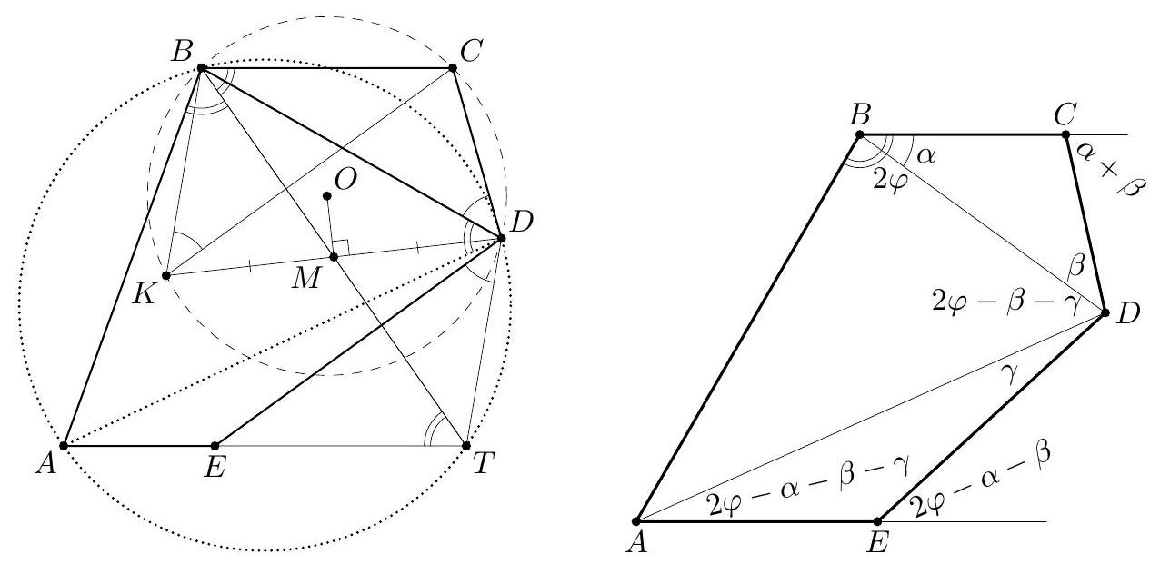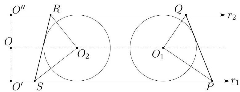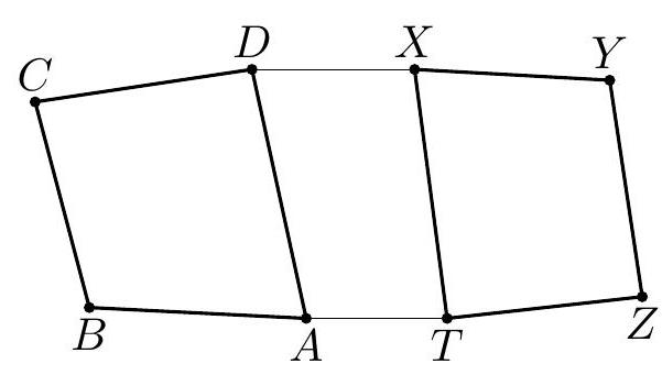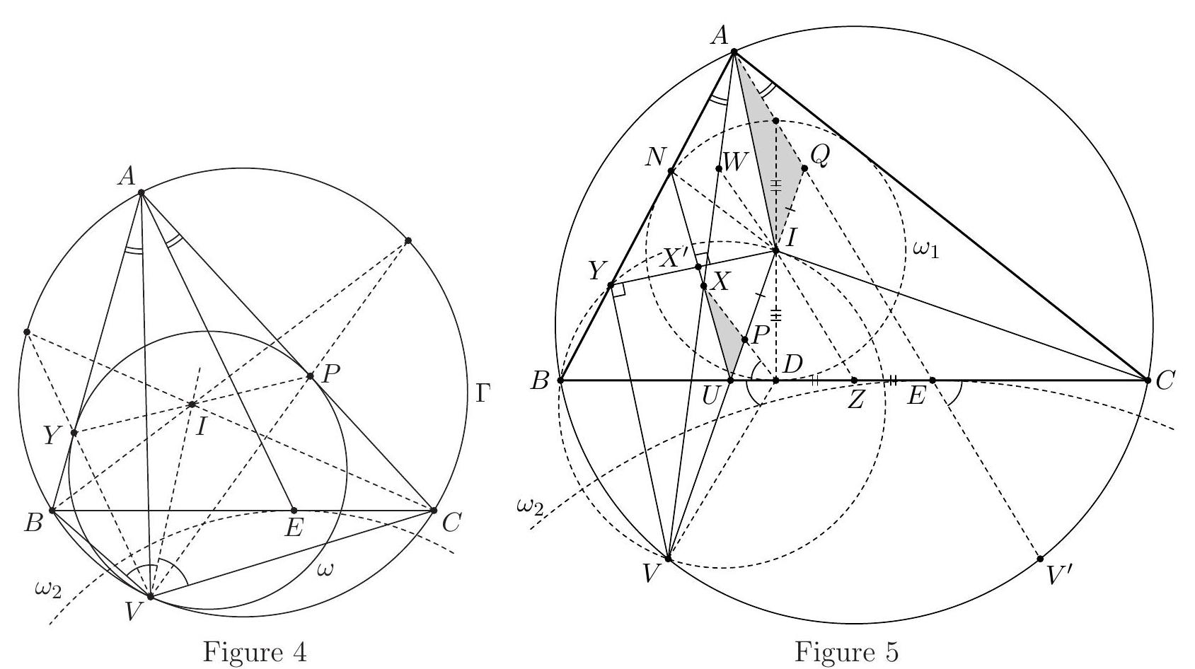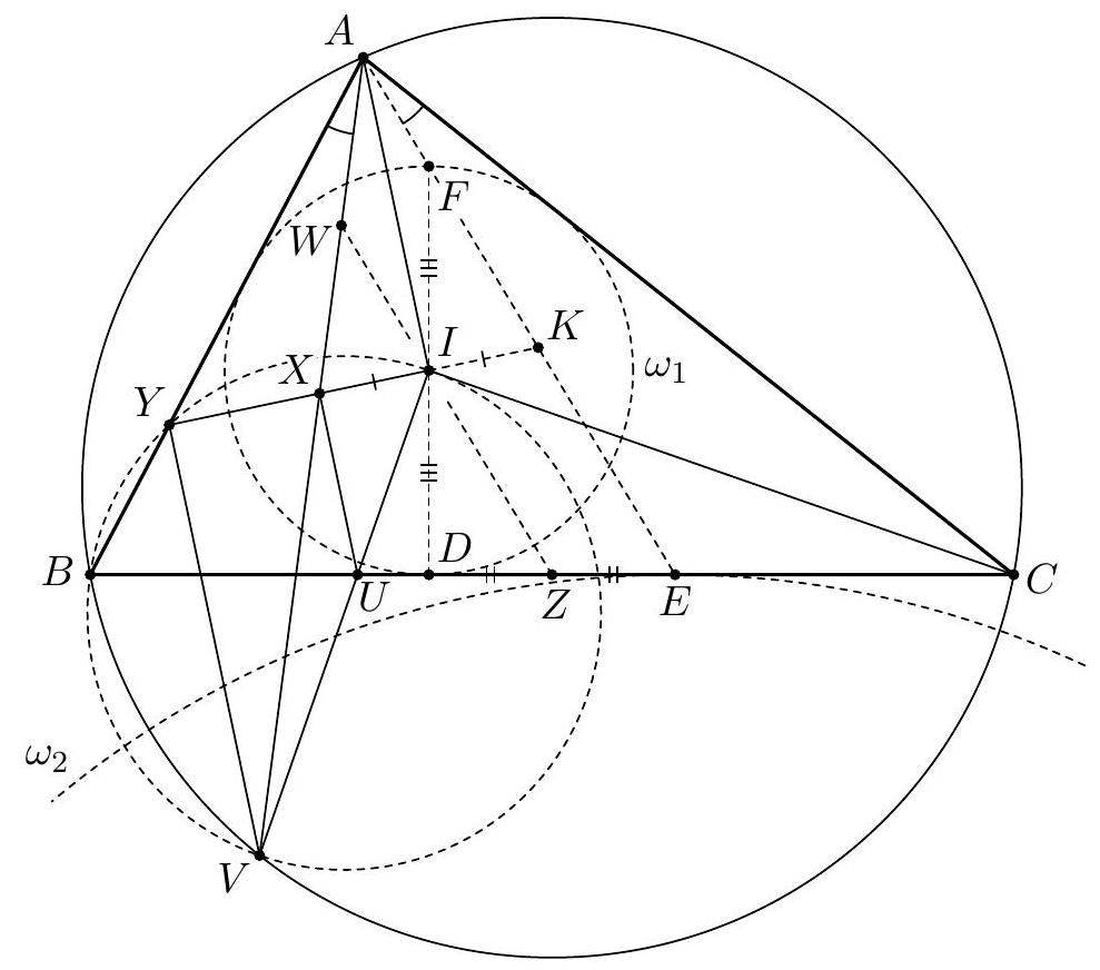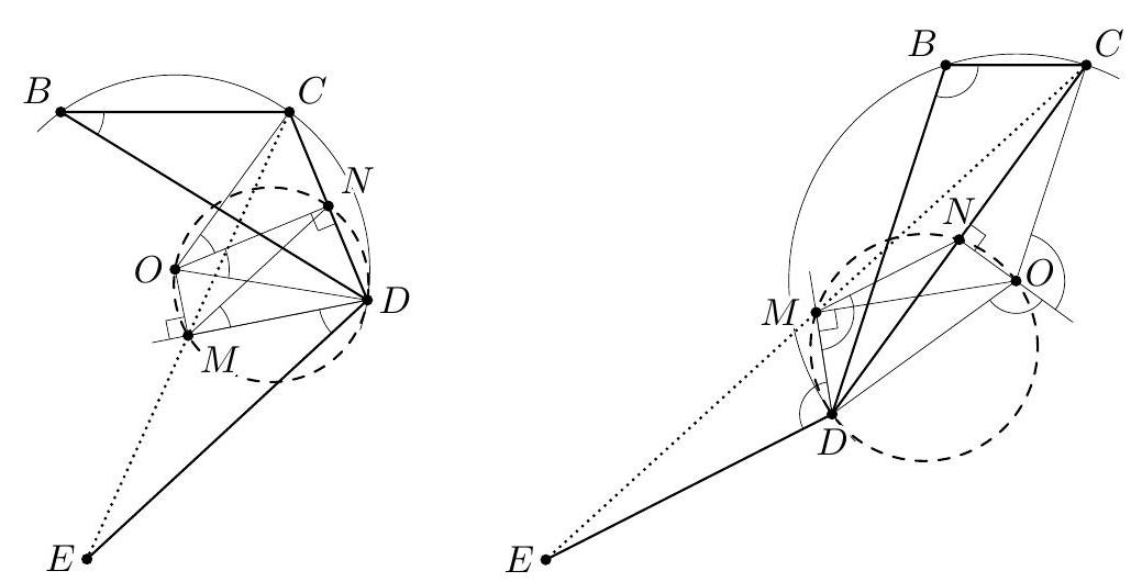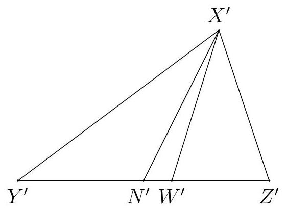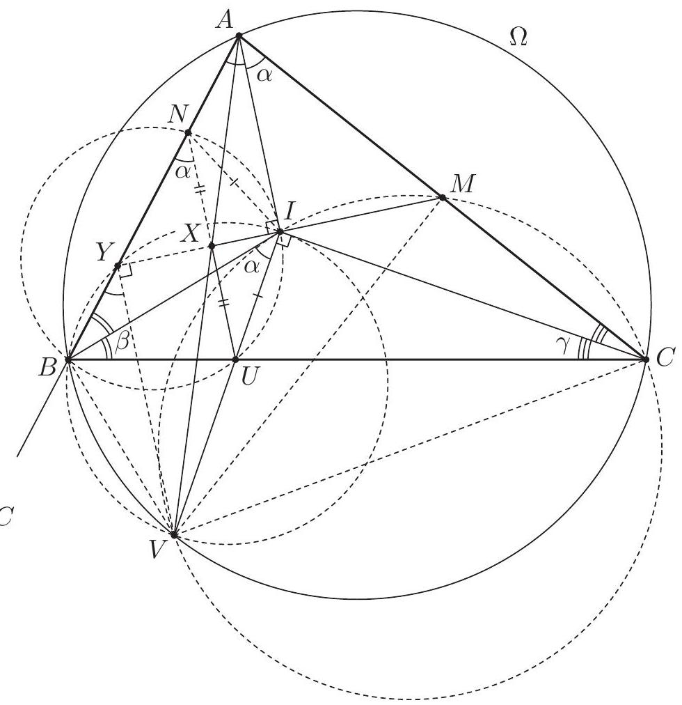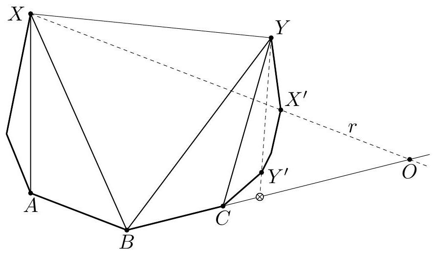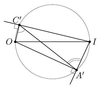s>O^{\prime \prime} Q+O^{\prime} S, \quad O^{\prime} P+O^{\prime \prime} R=s=O^{\prime \prime} Q+O^{\prime} S . +$$ + + + +Once this is established, the proof of the original statement for $B C \| A D$ is analogous to the one in the intersecting case. One replaces products by sums of relevant segments. + +G8. Let $A B C$ be a triangle with circumcircle $\omega$ and $\ell$ a line without common points with $\omega$. Denote by $P$ the foot of the perpendicular from the center of $\omega$ to $\ell$. The side-lines $B C, C A, A B$ intersect $\ell$ at the points $X, Y, Z$ different from $P$. Prove that the circumcircles of the triangles $A X P, B Y P$ and $C Z P$ have a common point different from $P$ or are mutually tangent at $P$. + +Solution 1. Let $\omega_{A}, \omega_{B}, \omega_{C}$ and $\omega$ be the circumcircles of triangles $A X P, B Y P, C Z P$ and $A B C$ respectively. The strategy of the proof is to construct a point $Q$ with the same power with respect to the four circles. Then each of $P$ and $Q$ has the same power with respect to $\omega_{A}, \omega_{B}, \omega_{C}$ and hence the three circles are coaxial. In other words they have another common point $P^{\prime}$ or the three of them are tangent at $P$. + +We first give a description of the point $Q$. Let $A^{\prime} \neq A$ be the second intersection of $\omega$ and $\omega_{A}$; define $B^{\prime}$ and $C^{\prime}$ analogously. We claim that $A A^{\prime}, B B^{\prime}$ and $C C^{\prime}$ have a common point. Once this claim is established, the point just constructed will be on the radical axes of the three pairs of circles $\left\{\omega, \omega_{A}\right\},\left\{\omega, \omega_{B}\right\},\left\{\omega, \omega_{C}\right\}$. Hence it will have the same power with respect to $\omega, \omega_{A}, \omega_{B}, \omega_{C}$. + + + +We proceed to prove that $A A^{\prime}, B B^{\prime}$ and $C C^{\prime}$ intersect at one point. Let $r$ be the circumradius of triangle $A B C$. Define the points $X^{\prime}, Y^{\prime}, Z^{\prime}$ as the intersections of $A A^{\prime}, B B^{\prime}, C C^{\prime}$ with $\ell$. Observe that $X^{\prime}, Y^{\prime}, Z^{\prime}$ do exist. If $A A^{\prime}$ is parallel to $\ell$ then $\omega_{A}$ is tangent to $\ell$; hence $X=P$ which is a contradiction. Similarly, $B B^{\prime}$ and $C C^{\prime}$ are not parallel to $\ell$. + +From the powers of the point $X^{\prime}$ with respect to the circles $\omega_{A}$ and $\omega$ we get + +$$ +X^{\prime} P \cdot\left(X^{\prime} P+P X\right)=X^{\prime} P \cdot X^{\prime} X=X^{\prime} A^{\prime} \cdot X^{\prime} A=X^{\prime} O^{2}-r^{2} +$$ + +hence + +$$ +X^{\prime} P \cdot P X=X^{\prime} O^{2}-r^{2}-X^{\prime} P^{2}=O P^{2}-r^{2} . +$$ + +We argue analogously for the points $Y^{\prime}$ and $Z^{\prime}$, obtaining + +$$ +X^{\prime} P \cdot P X=Y^{\prime} P \cdot P Y=Z^{\prime} P \cdot P Z=O P^{2}-r^{2}=k^{2} +$$ + +In these computations all segments are regarded as directed segments. We keep the same convention for the sequel. + +We prove that the lines $A A^{\prime}, B B^{\prime}, C C^{\prime}$ intersect at one point by CEVA's theorem. To avoid distracting remarks we interpret everything projectively, i. e. whenever two lines are parallel they meet at a point on the line at infinity. + +Let $U, V, W$ be the intersections of $A A^{\prime}, B B^{\prime}, C C^{\prime}$ with $B C, C A, A B$ respectively. The idea is that although it is difficult to calculate the ratio $\frac{B U}{C U}$, it is easier to deal with the cross-ratio $\frac{B U}{C U} / \frac{B X}{C X}$ because we can send it to the line $\ell$. With this in mind we apply MEnELaus' theorem to the triangle $A B C$ and obtain $\frac{B X}{C X} \cdot \frac{C Y}{A Y} \cdot \frac{A Z}{B Z}=1$. Hence Ceva's ratio can be expressed as + +$$ +\frac{B U}{C U} \cdot \frac{C V}{A V} \cdot \frac{A W}{B W}=\frac{B U}{C U} / \frac{B X}{C X} \cdot \frac{C V}{A V} / \frac{C Y}{A Y} \cdot \frac{A W}{B W} / \frac{A Z}{B Z} +$$ + + + +Project the line $B C$ to $\ell$ from $A$. The cross-ratio between $B C$ and $U X$ equals the cross-ratio between $Z Y$ and $X^{\prime} X$. Repeating the same argument with the lines $C A$ and $A B$ gives + +$$ +\frac{B U}{C U} \cdot \frac{C V}{A V} \cdot \frac{A W}{B W}=\frac{Z X^{\prime}}{Y X^{\prime}} / \frac{Z X}{Y X} \cdot \frac{X Y^{\prime}}{Z Y^{\prime}} / \frac{X Y}{Z Y} \cdot \frac{Y Z^{\prime}}{X Z^{\prime}} / \frac{Y Z}{X Z} +$$ + +and hence + +$$ +\frac{B U}{C U} \cdot \frac{C V}{A V} \cdot \frac{A W}{B W}=(-1) \cdot \frac{Z X^{\prime}}{Y X^{\prime}} \cdot \frac{X Y^{\prime}}{Z Y^{\prime}} \cdot \frac{Y Z^{\prime}}{X Z^{\prime}} +$$ + +The equations (1) reduce the problem to a straightforward computation on the line $\ell$. For instance, the transformation $t \mapsto-k^{2} / t$ preserves cross-ratio and interchanges the points $X, Y, Z$ with the points $X^{\prime}, Y^{\prime}, Z^{\prime}$. Then + +$$ +\frac{B U}{C U} \cdot \frac{C V}{A V} \cdot \frac{A W}{B W}=(-1) \cdot \frac{Z X^{\prime}}{Y X^{\prime}} / \frac{Z Z^{\prime}}{Y Z^{\prime}} \cdot \frac{X Y^{\prime}}{Z Y^{\prime}} / \frac{X Z^{\prime}}{Z Z^{\prime}}=-1 +$$ + +We proved that CEvA's ratio equals -1 , so $A A^{\prime}, B B^{\prime}, C C^{\prime}$ intersect at one point $Q$. + +Comment 1. There is a nice projective argument to prove that $A X^{\prime}, B Y^{\prime}, C Z^{\prime}$ intersect at one point. Suppose that $\ell$ and $\omega$ intersect at a pair of complex conjugate points $D$ and $E$. Consider a projective transformation that takes $D$ and $E$ to $[i ; 1,0]$ and $[-i, 1,0]$. Then $\ell$ is the line at infinity, and $\omega$ is a conic through the special points $[i ; 1,0]$ and $[-i, 1,0]$, hence it is a circle. So one can assume that $A X, B Y, C Z$ are parallel to $B C, C A, A B$. The involution on $\ell$ taking $X, Y, Z$ to $X^{\prime}, Y^{\prime}, Z^{\prime}$ and leaving $D, E$ fixed is the involution changing each direction to its perpendicular one. Hence $A X, B Y, C Z$ are also perpendicular to $A X^{