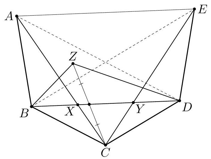 r$, then, similarly, $R\left(q^{+}\right) \leqslant 0 \ell_{j}>r_{i}$. + +Clearly, there is no town which can sweep $T_{n}$ away from the right. Then we may choose the leftmost town $T_{k}$ which cannot be swept away from the right. One can observe now that no town $T_{i}$ with $i>k$ may sweep away some town $T_{j}$ with $j m$. As we have already observed, $p$ cannot be greater than $k$. On the other hand, $T_{m}$ cannot sweep $T_{p}$ away, so a fortiori it cannot sweep $T_{k}$ away. + +Claim 2. Any town $T_{m}$ with $m \neq k$ can be swept away by some other town. + +Proof. If $m k$. + +Let $T_{p}$ be a town among $T_{k}, T_{k+1}, \ldots, T_{m-1}$ having the largest right bulldozer. We claim that $T_{p}$ can sweep $T_{m}$ away. If this is not the case, then $r_{p}<\ell_{q}$ for some $q$ with $p 1$. Firstly, we find a town which can be swept away by each of its neighbors (each town has two neighbors, except for the bordering ones each of which has one); we call such town a loser. Such a town exists, because there are $n-1$ pairs of neighboring towns, and in each of them there is only one which can sweep the other away; so there exists a town which is a winner in none of these pairs. + +Notice that a loser can be swept away, but it cannot sweep any other town away (due to its neighbors' protection). Now we remove a loser, and suggest its left bulldozer to its right neighbor (if it exists), and its right bulldozer to a left one (if it exists). Surely, a town accepts a suggestion if a suggested bulldozer is larger than the town's one of the same orientation. + +Notice that suggested bulldozers are useless in attack (by the definition of a loser), but may serve for defensive purposes. Moreover, each suggested bulldozer's protection works for the same pairs of remaining towns as before the removal. + +By the induction hypothesis, the new configuration contains exactly one town which cannot be swept away. The arguments above show that the initial one also satisfies this property. + +Solution 3. We separately prove that $(i)$ there exists a town which cannot be swept away, and that (ii) there is at most one such town. We also make use of the two observations from the previous solutions. +To prove ( $i$ ), assume contrariwise that every town can be swept away. Let $t_{1}$ be the leftmost town; next, for every $k=1,2, \ldots$ we inductively choose $t_{k+1}$ to be some town which can sweep $t_{k}$ away. Now we claim that for every $k=1,2, \ldots$, the town $t_{k+1}$ is to the right of $t_{k}$; this leads to the contradiction, since the number of towns is finite. + +Induction on $k$. The base case $k=1$ is clear due to the choice of $t_{1}$. Assume now that for all $j$ with $1 \leqslant jj$ and $a_{i} \frac{n}{2}$, then we have $O A_{i-n / 2+1}=A_{i} A_{i-n / 2+1}$. This completes the proof. + +An example of such a construction when $n=10$ is shown in Figure 1. + + +Figure 1 + + +Figure 2 + +Comment (a). There are many ways to construct an example by placing equilateral triangles in a circle. Here we present one general method. + +Let $O$ be the center of a circle and let $A_{1}, B_{1}, \ldots, A_{k}, B_{k}$ be distinct points on the circle such that the triangle $O A_{i} B_{i}$ is equilateral for each $i$. Then $\mathcal{V}=\left\{O, A_{1}, B_{1}, \ldots, A_{k}, B_{k}\right\}$ is balanced. To construct a set of even cardinality, put extra points $C, D, E$ on the circle such that triangles $O C D$ and $O D E$ are equilateral (see Figure 2). Then $\mathcal{V}=\left\{O, A_{1}, B_{1}, \ldots, A_{k}, B_{k}, C, D, E\right\}$ is balanced. + +Part (b). We now show that there exists a balanced, center-free set containing $n$ points for all odd $n \geqslant 3$, and that one does not exist for any even $n \geqslant 3$. + +If $n$ is odd, then let $\mathcal{V}$ be the set of vertices of a regular $n$-gon. We have shown in part ( $a$ ) that $\mathcal{V}$ is balanced. We claim that $\mathcal{V}$ is also center-free. Indeed, if $P$ is a point such that +$P A=P B=P C$ for some three distinct vertices $A, B$ and $C$, then $P$ is the circumcenter of the $n$-gon, which is not contained in $\mathcal{V}$. + +Now suppose that $\mathcal{V}$ is a balanced, center-free set of even cardinality $n$. We will derive a contradiction. For a pair of distinct points $A, B \in \mathcal{V}$, we say that a point $C \in \mathcal{V}$ is associated with the pair $\{A, B\}$ if $A C=B C$. Since there are $\frac{n(n-1)}{2}$ pairs of points, there exists a point $P \in \mathcal{V}$ which is associated with at least $\left\lceil\frac{n(n-1)}{2} / n\right\rceil=\frac{n}{2}$ pairs. Note that none of these $\frac{n}{2}$ pairs can contain $P$, so that the union of these $\frac{n}{2}$ pairs consists of at most $n-1$ points. Hence there exist two such pairs that share a point. Let these two pairs be $\{A, B\}$ and $\{A, C\}$. Then $P A=P B=P C$, which is a contradiction. + +Comment (b). We can rephrase the argument in graph theoretic terms as follows. Let $\mathcal{V}$ be a balanced, center-free set consisting of $n$ points. For any pair of distinct vertices $A, B \in \mathcal{V}$ and for any $C \in \mathcal{V}$ such that $A C=B C$, draw directed edges $A \rightarrow C$ and $B \rightarrow C$. Then all pairs of vertices generate altogether at least $n(n-1)$ directed edges; since the set is center-free, these edges are distinct. So we must obtain a graph in which any two vertices are connected in both directions. Now, each vertex has exactly $n-1$ incoming edges, which means that $n-1$ is even. Hence $n$ is odd. + +C3. For a finite set $A$ of positive integers, we call a partition of $A$ into two disjoint nonempty subsets $A_{1}$ and $A_{2}$ good if the least common multiple of the elements in $A_{1}$ is equal to the greatest common divisor of the elements in $A_{2}$. Determine the minimum value of $n$ such that there exists a set of $n$ positive integers with exactly 2015 good partitions. +(Ukraine) +Answer. 3024. +Solution. Let $A=\left\{a_{1}, a_