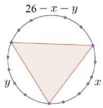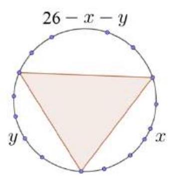 Solution. The vertices of Anya's triangle divide the circle into three arcs (see figure). Let $x, y$, and $26-x-y$ be the number of points on these arcs (see figure), excluding the vertices of the triangle itself. For a "shot" with endpoints at points $k$ and $m$ to not hit the ship, both these points must lie on one of the arcs. Clearly, two different points can be chosen on the arc containing $x$ points in $C_{x}^{2}$ ways. The same applies to the other arcs. Therefore, the number $N$ of "safe" shots is the sum $N=C_{x}^{2}+C_{y}^{2}+C_{26-x-y}^{2}$. Then the next shot will definitely "hit" the ship, so $K=N+1$.