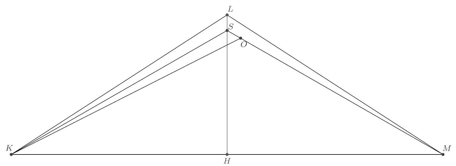 Solution. Let $L H$ be the height/median/bisector of the triangle. Let $S$ be the intersection of ray $M O$ and segment $L H$. Note that $K S=S M$. For example, since in triangle $K S M$ the median SH coincides with the height.