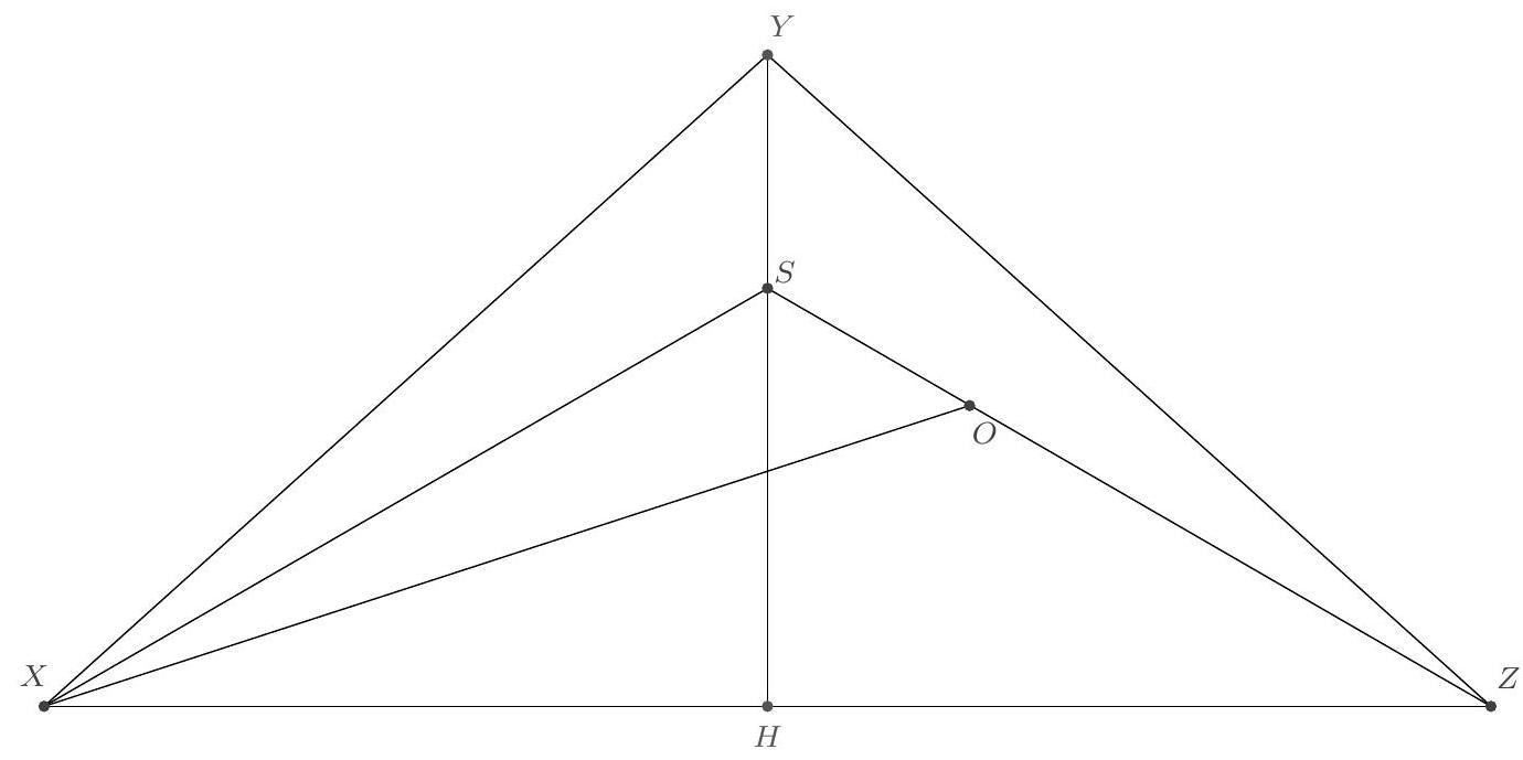 Solution. Let $B H$ be the height/median/bisector of the triangle. Let $S$ be the intersection of ray $C O$ and segment $B H$. Note that $A S=S C$. For example, in triangle $A S C$, the median $S H$ coincides with the height.
