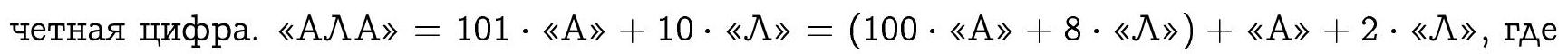 Criteria. The divisibility rule for 8 is formulated and it is explicitly stated that "А" is an even digit - 1 point. It is proven that "А" + 2 "Л" or 5 "А" + 10 "Л" is divisible by 8 - 3 points. For each
