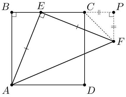 The square $A B C D$ and the isosceles right triangle $A E F$ with $\angle A E F = 90^{\circ}$ are arranged so that point $E$ lies on the segment $B C$. Determine the measure of angle $D C F$.