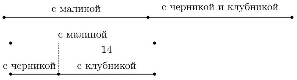 Solution. First method. Since the number of raspberry pies is half of the total, the number of blueberry and strawberry pies together is the same as the number of raspberry pies (see Fig. 5.3). Moreover, there are 14 fewer blueberry pies than raspberry pies, so these 14 pies are strawberry pies. Therefore, the number of raspberry and blueberry pies: \(14 \cdot 2 = 28\), which means a total of \(28 + 14 = 42\) pies were baked. Thus, the number of raspberry pies is \(42 : 2 = 21\), blueberry pies - 7, and strawberry pies - 14.