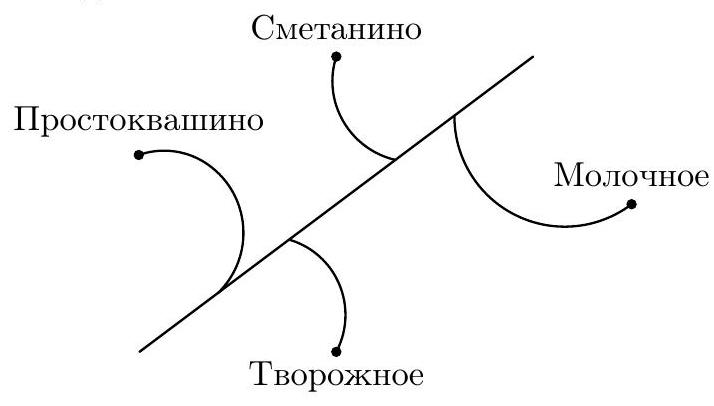 Solution. The distance from Prostokvashino to Smetanino with a detour to Tvorozhnoye is $9+8=17$ (km), and without the detour - 13 km. Therefore, the detour to Tvorozhnoye (from the highway and back) is 4 km. The distance from Prostokvashino to Molochnoye with a detour to Tvorozhnoye is $9+14=23$ (km), and without the detour: $23-4=19$ (km).