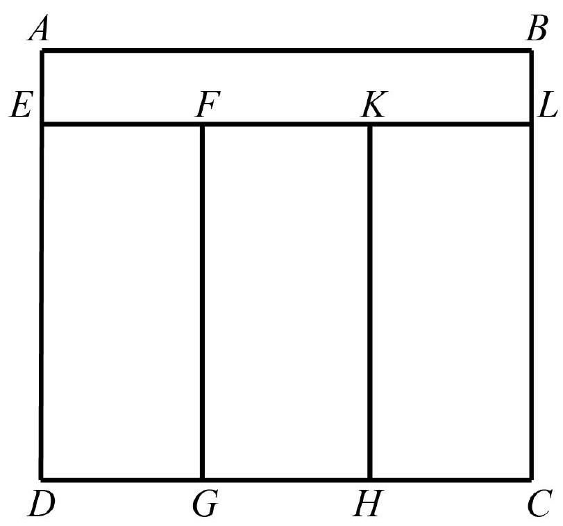 Solution. Since the perimeters of the three vertical rectangles are equal and the segments $E D, F G, K H$ and $L C$ are also equal, the segments $E F$, $F K$ and $K L$ are also equal. Therefore, each of