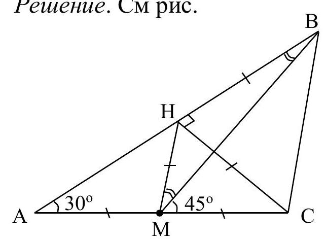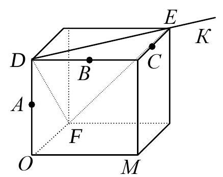 2nd method. Introduce a coordinate system with the origin at point $O$, axes $O x, O y$, and $O z$ directed along vectors $\overrightarrow{\mathrm{OM}}, \overrightarrow{\mathrm{OF}}$, and $\overrightarrow{\mathrm{OD}}$ respectively, and let the edge of the cube be 2. Then $A(0 ; 0 ; 1), B(1 ; 0 ; 2)$, $C(2 ; 1 ; 2)$. Therefore, $\overrightarrow{\mathrm{BA}}(-1 ; 0 ;-1), |\overrightarrow{\mathrm{BA}}| = \sqrt{2}, \overrightarrow{\mathrm{BC}}(1 ; 1 ; 0), |\overrightarrow{\mathrm{BC}}| = \sqrt{2}$. Now we find the scalar product of vectors $\overrightarrow{\mathrm{BA}}$ and $\overrightarrow{\mathrm{BC}}$ in two ways: