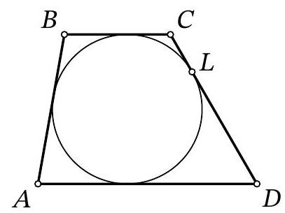 Solution. Let's mark the center of the circle $I$, as well as the points of tangency $P, Q, K$ with the sides $B C$, $A D, A B$ respectively. Note that $I P \perp B C, I Q \perp A D$, i.e., points $P, I, Q$ lie on the same line, and $P Q$ is the height of the given trapezoid, equal to the diameter of its inscribed circle. Also, the segments of tangents $A K=A Q, B K=B P, C P=C L, D L=D Q$ are equal.