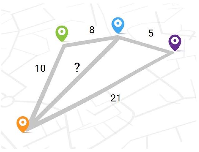 Problem 9.3. Four cities and five roads are arranged as shown in the figure. The lengths of all roads are equal to an integer number of kilometers. The lengths of four roads are indicated in the figure. How many kilometers is the length of the remaining one?