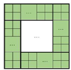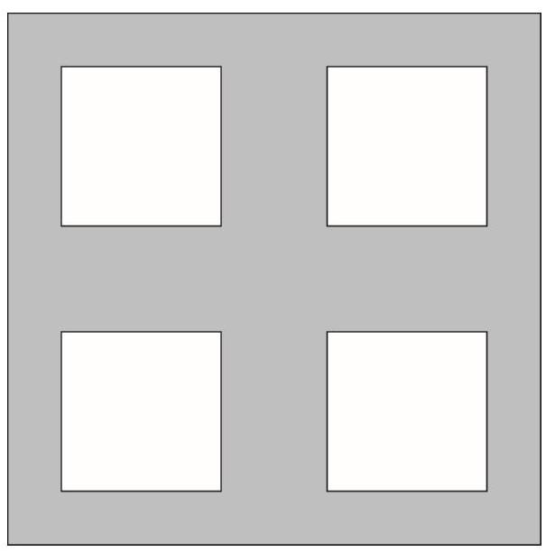 Let the side of the larger square be 10x. The area of the smaller square is $9 \%$ of the area of the larger square, which is $9 / 100 \cdot 100 x^{2}=9 x^{2}$. After removing four smaller squares, the remaining area is $100 x^{2}-4 \cdot 9 x^{2}=64 x^{2}=256 \text{ cm}^{2}$. Therefore, $x^{2}=4$. Hence, $x=2$ cm, and the entire side is $10 x=20$ cm.