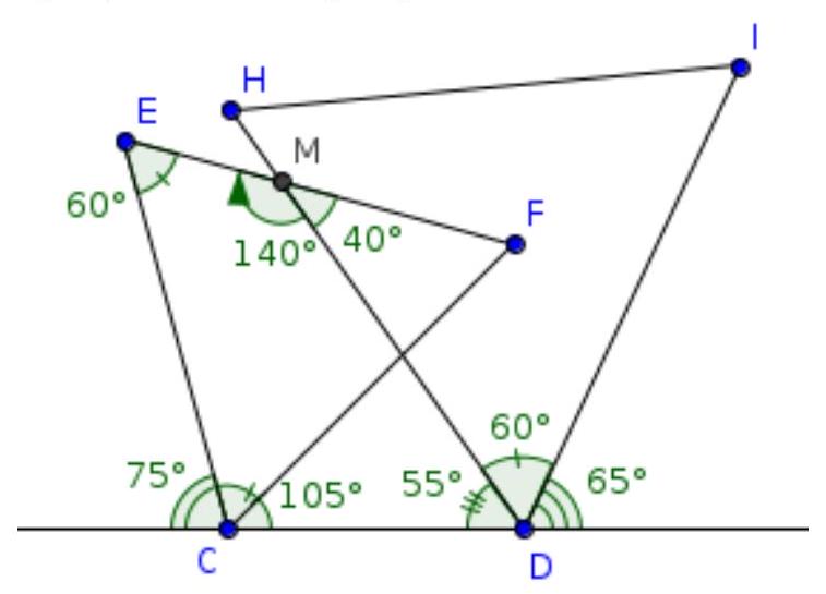 - $\angle C D M=180^{\circ}-60^{\circ}-65^{\circ}=55^{\circ}$: angle $\angle C D M$ is adjacent to the angle formed by angle $\angle H D I$, which is $60^{\circ}$, as it is an angle of the equilateral triangle, and an angle of $65^{\circ}$;