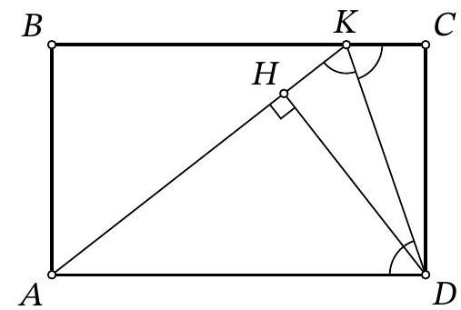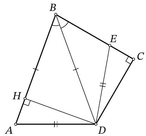 Notice that the right triangles $BDH$ and $BDC$ are equal by the common hypotenuse $BD$ and the acute angle at vertex $B$. Therefore, $BH = BC$ and $DH = CD$.