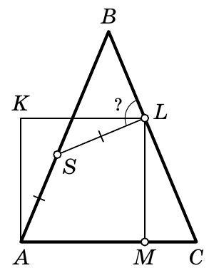 Solution. Drop a perpendicular $PH$ from point $P$ to side $AB$. Since triangle $KBL$ is isosceles and right-angled, $\angle PKH = 45^\circ$. Therefore, triangle $KPH$ is also isosceles and $KH = HP$.