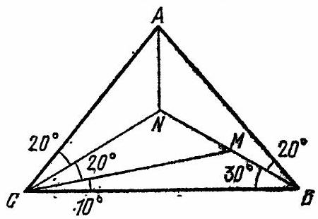Fig. 12. at point $M_{1} ;\left|C M_{1}\right|=|C M|$, since the angles subtended by them $\left(80^{\circ}\right.$ and $\left.100^{\circ}\right)$ sum up to $180^{\circ}$; $\widehat{M_{1} C M}=\widehat{M_{1} B M}=20^{\circ}$, i.e., $N C$ is the bisector of angle $M_{1} C M$, and $\triangle M_{1} C N=\triangle N C M, \widehat{N M C}=\widehat{N M_{1} C}=\widehat{C M B}=25^{\circ}$.