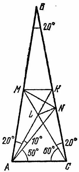 Fig. 15. Since $\triangle B N C$ is isosceles $\left(\widehat{N B C}=\widehat{N C B}=50^{\circ}\right)$, then $\widehat{K N C}=$ $=40^{\circ}$. Point $L$ is the intersection of the angle bisectors of triangle $N K C$ ( $L K$ and $L C$ are angle bisectors). Therefore, $N L$ is also the angle bisector of $\angle K N C$ and $\widehat{L N B}=60^{\circ} ; B N$, in turn, is the angle bisector of $\angle M B L$; moreover, $B N \perp M L$; thus, $B N$ bisects $M L$ and $\widehat{M N B}=\widehat{B N L}=60^{\circ}$, and $\widehat{N M C}=$ $=30^{\circ}$.