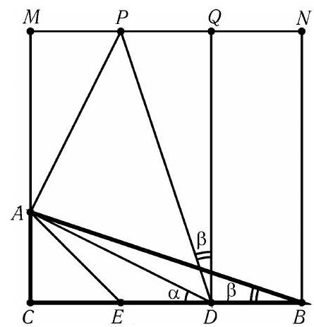 Second solution. Since $D E = 1, E A = \sqrt{2}, E B = 2, A D = \sqrt{5}$, and $B A = \sqrt{10}$, we have $D E: A E = E A: E B = A D: B A$ and $\triangle D E A \sim \triangle A E B$. Therefore, $\angle A B C = \angle E A D$. Additionally, $\angle A E C = \angle C A E = 45^{\circ}$. Therefore, $\angle A B C + \angle A D C + \angle A E C = (\angle E A D + \angle C A E) + \angle A D C = \angle C A D + \angle A D C = 90^{\circ}$.