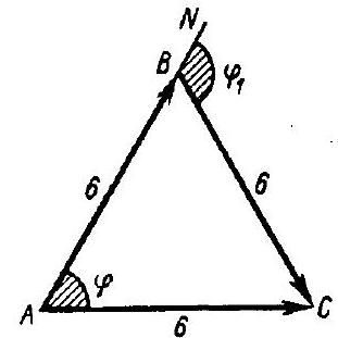 b) The angle between the vectors $\overrightarrow{A B}$ and $\overrightarrow{B C}$ (i.e., the angle between their directions) is the angle $\varphi_{1}=120^{\circ}$, therefore