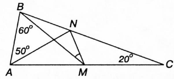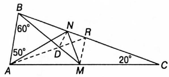 227. Since the sum of the interior angles of a triangle is two right angles, or \(180^{\circ}\), \(\angle CBA = \angle CAB = 80^{\circ}\), \(\angle CBM = 20^{\circ}\), and \(\angle BAN = 50^{\circ} = \angle BNA\) (so \(BN = AB\)). Draw \(MR\)