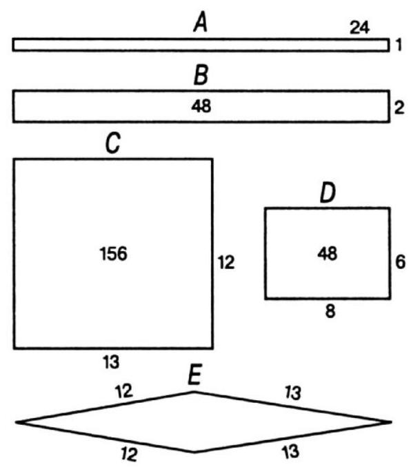 275. The old answer is that if you arrange the poles as shown in case \(A\), then by adding two poles at each end, as in case \(B\), you will get double the area. It should be noted that, firstly, the problem does not specify the shape of the enclosure. Secondly, even if it were required that the original enclosure had dimensions of \(24 \times 1\), the answer would still be incorrect, because if you arrange the poles as in case \(C\), the area will increase from 24 "square poles" to 156, and the enclosure will hold 650 sheep, with the number of poles remaining the same. Moreover, you can double the area as in case \(D\), using only 28 poles. If it is required to use all the poles and double the area exactly, you can do so as shown in case \(E\).