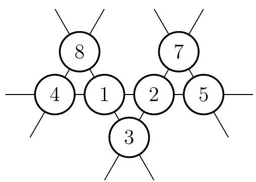 Problem 8. Seryozha placed numbers from 1 to 8 in the circles so that each number, except one, was used exactly once. It turned out that the sums of the numbers on each of the five lines are equal. Which number did Seryozha not use?