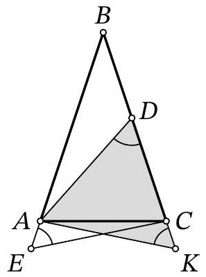 Problem 7.8. Given an isosceles triangle $ABC (AB = BC)$. On the ray $BA$ beyond point $A$, point $E$ is marked, and on side $BC$, point $D$ is marked. It is known that