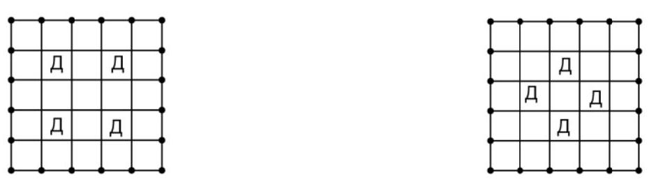Solution. There are 9 possible positions for the cross on the board, which is the same as the number of positions for the central cell of the cross. A detector has two states, so the total number of possible states for three detectors is $2^{3}=8$, and thus, they cannot distinguish between 9 positions of the cross. Examples of possible arrangements of four detectors are shown in the figures