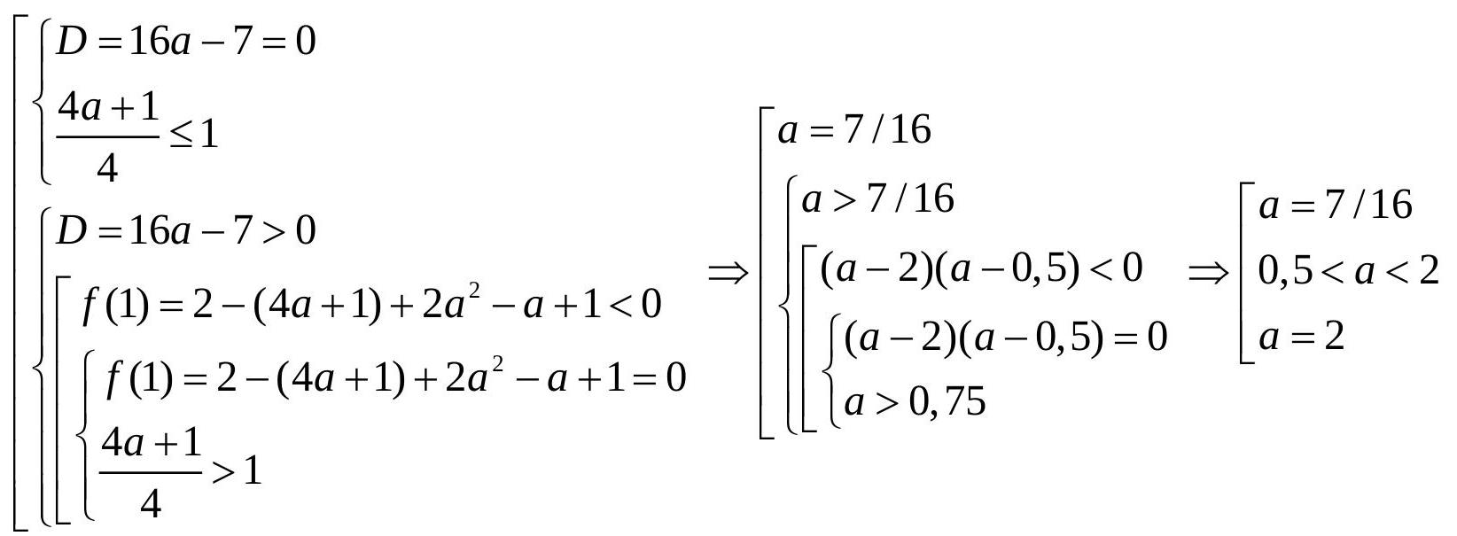 & y_{1,2}=\frac{(4 a+1) \pm \sqrt{(4 a+1)^{2}-8\left(2 a^{2}-a+1\right)}}{4}=\frac{4 a+1 \pm \sqrt{16 a-7}}{4}