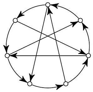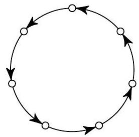 Problem 4. Seven cities are connected in a circle by seven one-way flights (see figure). Assign (draw with arrows) several more one-way flights so that from any city to any other, one could get there with no more than two transfers. Try to make the number of additional flights as small as possible.