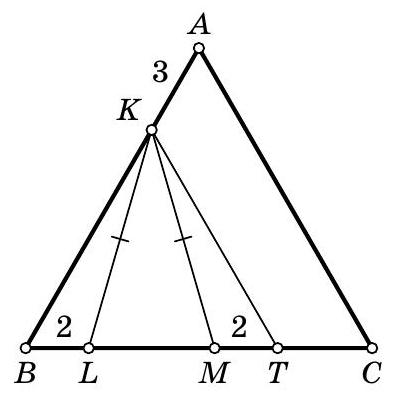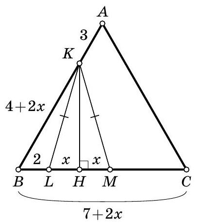Second solution. Draw the height $K H$ of the isosceles triangle $K L M$. It is also its median, so $L H=H M$. Let $L H=H M=x$. Triangle $K B H$ is a right triangle with angle $B$ equal to $60^{\circ}$, so its hypotenuse $K B$ is twice its leg $B H$. Since $B H=2+x$, then $K B=2 B H=4+2 x$, and thus $B A=B K+K A=4+2 x+3=7+2 x$. Triangle $A B C$ is equilateral, so $B C=B A=7+2 x$. Therefore, $M C=B C-B M=(7+2 x)-(2+2 x)=5$.