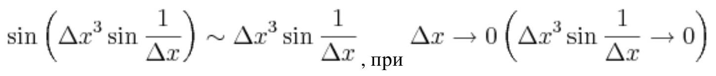 \sin \left(\frac{1}{2} \cdot \Delta x \sin \frac{1}{\Delta x}\right) \sim \frac{1}{2} \cdot \Delta x \sin \frac{1}{\Delta x}, \text { as } \Delta x \rightarrow 0\left(\frac{1}{2} \cdot \Delta x \sin \frac{1}{\Delta x} \rightarrow 0\right)