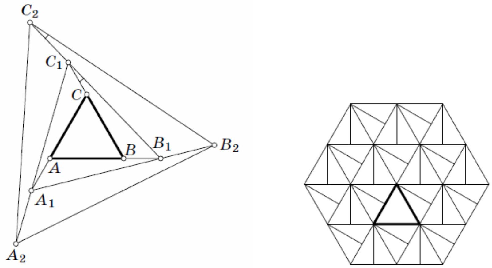 Example 1. On the extensions of the sides of the cut-out triangle, mark points \(A_1, B_1, C_1\) such that \(AA_1 = BB_1 = CC_1 = xAB\) (see the left figure). Triangles \(A_1AB_1, B_1BC_1\), and \(C_1CA_1\) are equal, and triangle \(A_1B_1C_1\) is equilateral. Now extend the sides of triangle \(A_1B_1C_1\) and mark points \(A_2, B_2, C_2\) such that \(A_1A_2 = B_1B_2 = C_1C_2 = xA_1B_1\). Triangles \(A_2A_1B_2, B_2B_1C_2\), and \(C_2C_1A_2\) are equal to each other and similar to triangle \(A_1A_2B_1\). Similarly, construct points \(A_3, B_3, C_3\) and so on. The sizes of triangles \(A_kB_kC_k\) grow in a geometric progression, so the entire plane will be covered. Thus, we have obtained a tiling of the plane into similar triangles of the form \(A_iB_{i-1}B_i, B_jB_{j-1}C_j\), and \(C_kC_{k-1}A_k\).