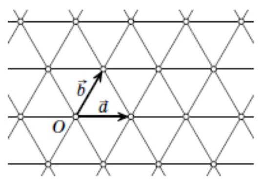 Proof of the lemma. Introduce the origin at one of the grid nodes and denote by $\$ \mid v e c\{a\} \$$ and $\$ \mid v e c\{b\} \$$ the radius vectors to the two nearest nodes, as shown in the figure. Then the grid nodes are points of the form $\$ m \mid v e c\{a\}+ n \mid v e c\{b\} \$$ for integers \$m $\$$ and \$n $\$$. By the pigeonhole principle, among five points, there will be two points $\$m_1 \mid v e c\{a\}+ n_1 \mid v e c\{b\} \$$ and $\$m_2 \mid v e c\{a\}+ n_2 \mid v e c\{b\} \$$, for which the parity of \$m_1 and \$ \$m_2\$, and the parity of \$n_1 and \$n_2\$, coincide simultaneously. The midpoint of the segment connecting these two points is the point $\$ \backslash frac \left\{m \_1+m \_2\right\} 2 \backslash m k e r n 2 m u \operatorname{vec}\{a\}+\backslash f r a c\left\{n \_1+n \_2\right\} 2 \backslash m k e r n 2 m u \operatorname{vec}\{b\} \$$$. It is a grid node, since the numbers $\$ \backslash frac \left\{m \_1+m \_2\right\} 2 \$$ and $\$ \backslash frac \left\{n \_1+n \_2\right\} 2 \$$ are integers due to the same parity of \$ \mathrm{~m} \_1 \$$ and \$m_2\$, and \$n_1\$, and \$n_2\.