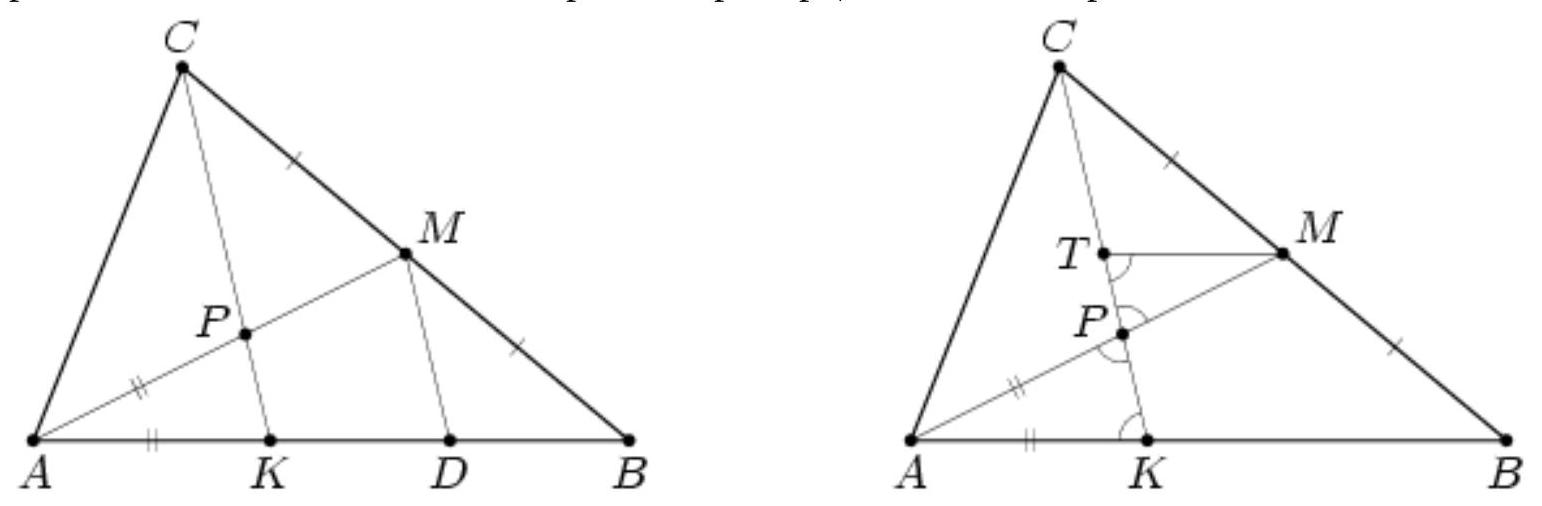 On side $A B$ of triangle $A B C$, a point $K$ is marked. Segment $C K$ intersects the median $A M$ of the triangle at point $P$. It turns out that $A K = A P$.