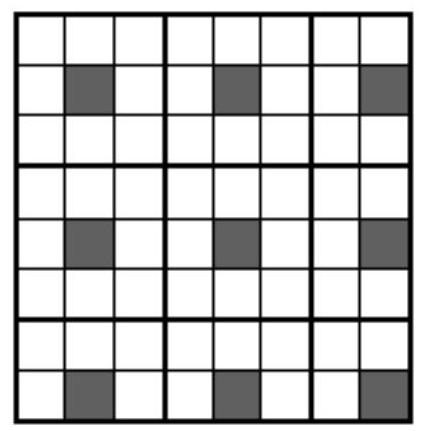 Evaluation. Let's divide the board into nine parts (see the figure). In each of them, a cell must be marked, otherwise the black cell contained in it can be added.